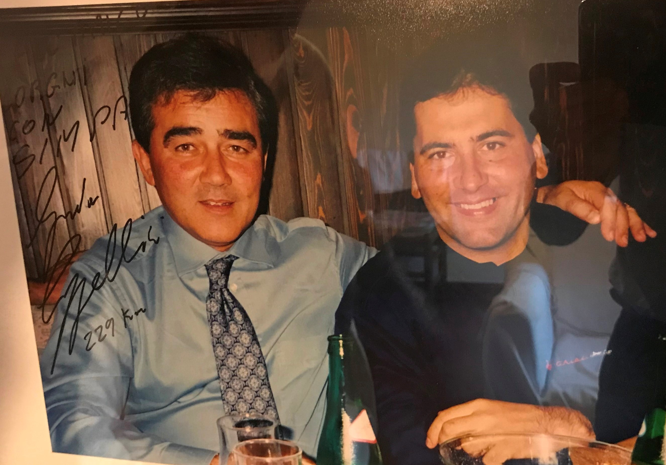 Ci-dessus Ermanno Corghi, en cravate, avec le pilote Guido Cappellini qui lui a dédicacé la photo "al caro Corghi con simpatia" en notant la vitesse de pointe de 229 km/h. photo collection Ermanno Corghi