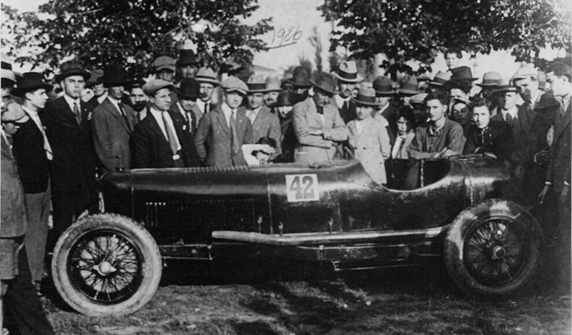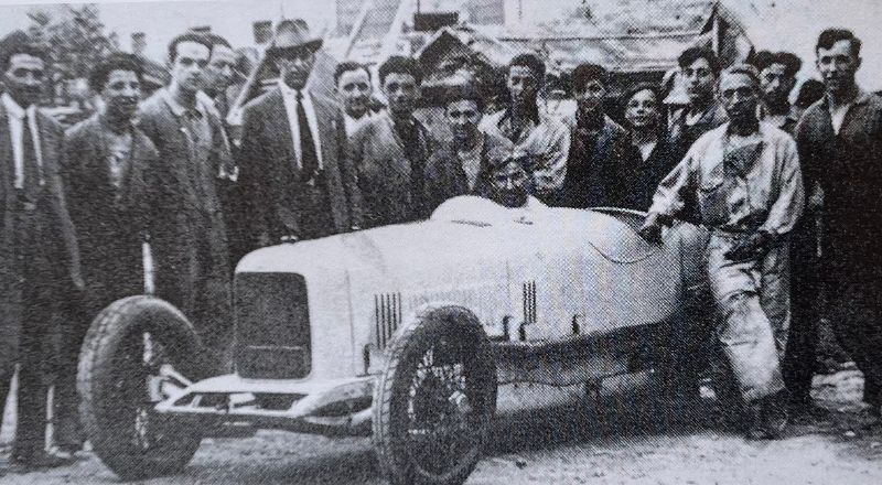 Ici Alfieri "limite" au circuit du lac de Garde : Ci-dessous la Tipo 26 (#11, celle de la Targa Florio) participe à la course du kilomètre lancé à Bologne en juin 1926 : Guerino Bertocchi (casquette - cravate) est le cinquième à partir de la gauche.