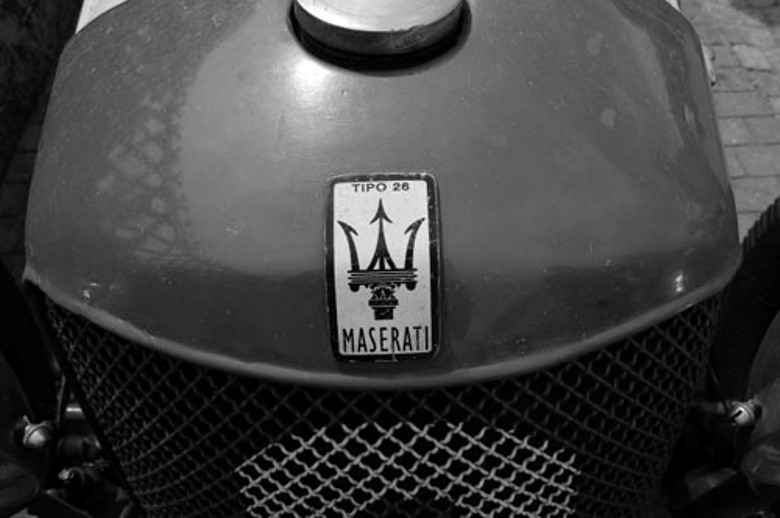 On voit bien sur cette photo les barres commandant la direction depuis la sortie du boitier et le système de freinage mécanique Perrot : Les six frères Maserati s'investirent dans l'industrie et la course automobile sauf Mario, artiste peintre, à qui la firme Maserati doit cependant son symbole, le trident stylisé inspiré de celui de la statue de Neptune trônant au centre de la grande place de Bologne. Le dessin originel de Mario Maserati est précieusement conservé :