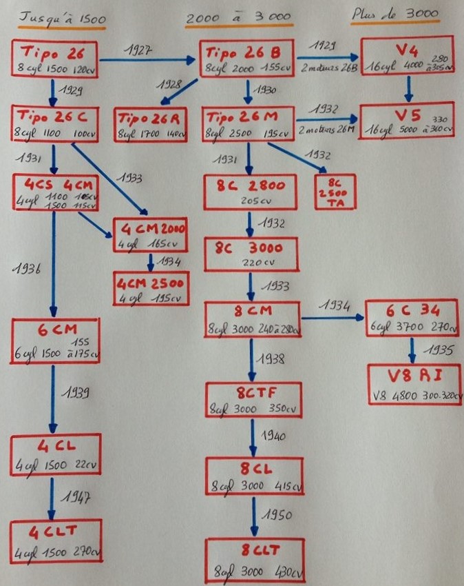 Ce n'est que vers 1931-1932 que l'appellation Tipo 26 s'arrêta (remplacée par le nombre de cylindres et la cylindrée) mais, comme vous le voyez sur le schema ci-dessus, c'est la Tipo 26 de 1.5 litres qui a engendré toute cette famille des Maserati à compresseur d'avant guerre ! C'est par elle que tout a commencé, et ce n'est pas fini presque 100 ans plus tard !!!