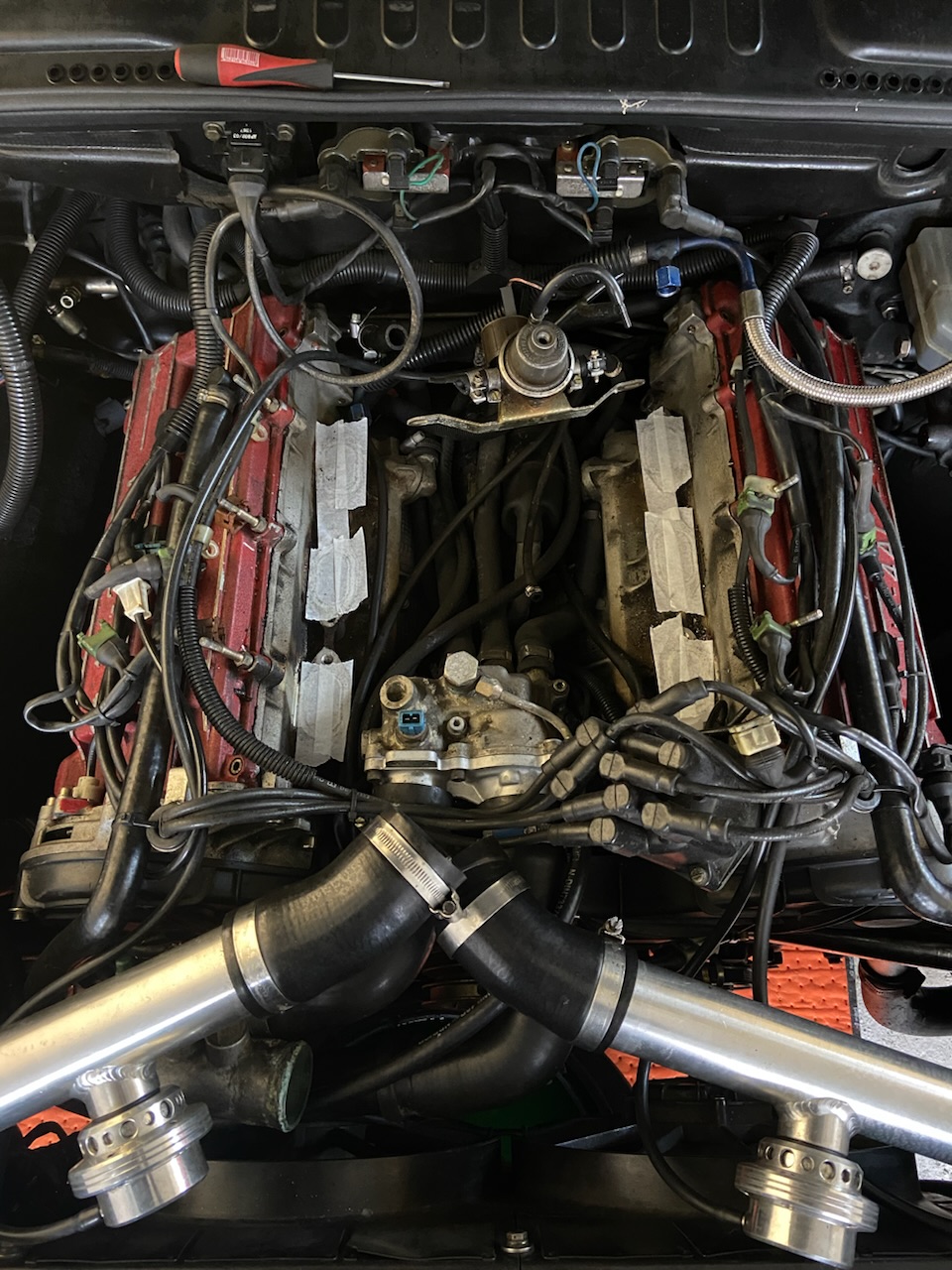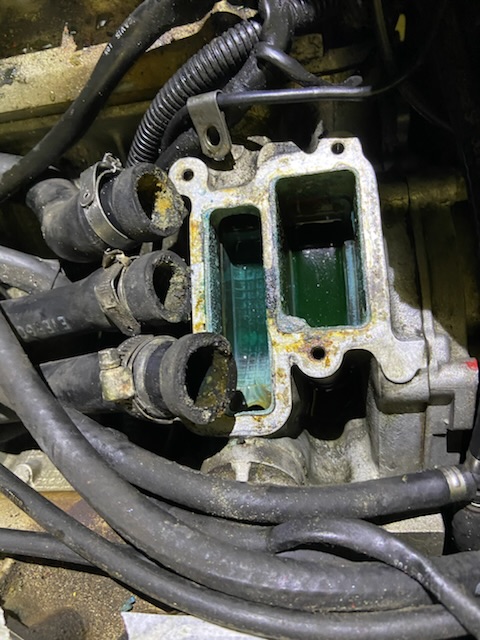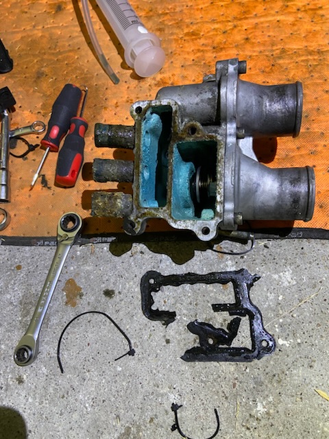 J’ai continué le démontage car je dois apporter le plénum en peinture ce soir et je compte aussi déposer le corps de thermostat pour le faire microbiller. Et ça sera pas du luxe.