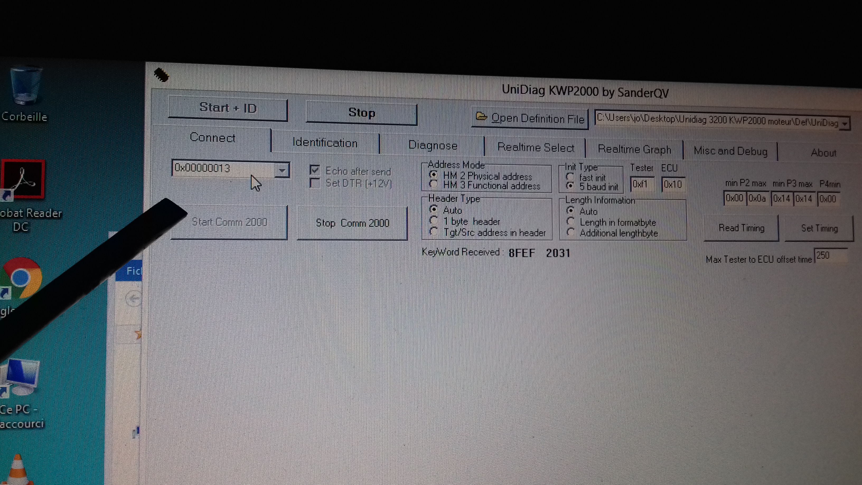 et après être allé dans le gestionnaire de périphériques et forcé le port COM4, j'obtiens ça, c'est-à-dire un début de dialogue puisque en haut du tournevis, un numéro qui s'affiche, et après avoir cliqué sur "Start Comm 2000" le numéro KeyWOrd Received s'affiche ...