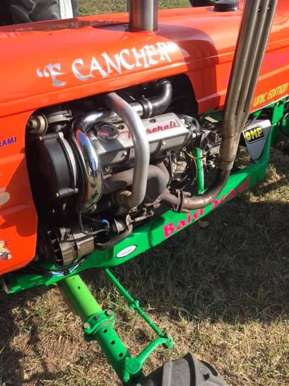 C'est effectivement un tracteur Masette (rien sur internet), un moteur de voiture dans un tracteur, une déco de culasse???