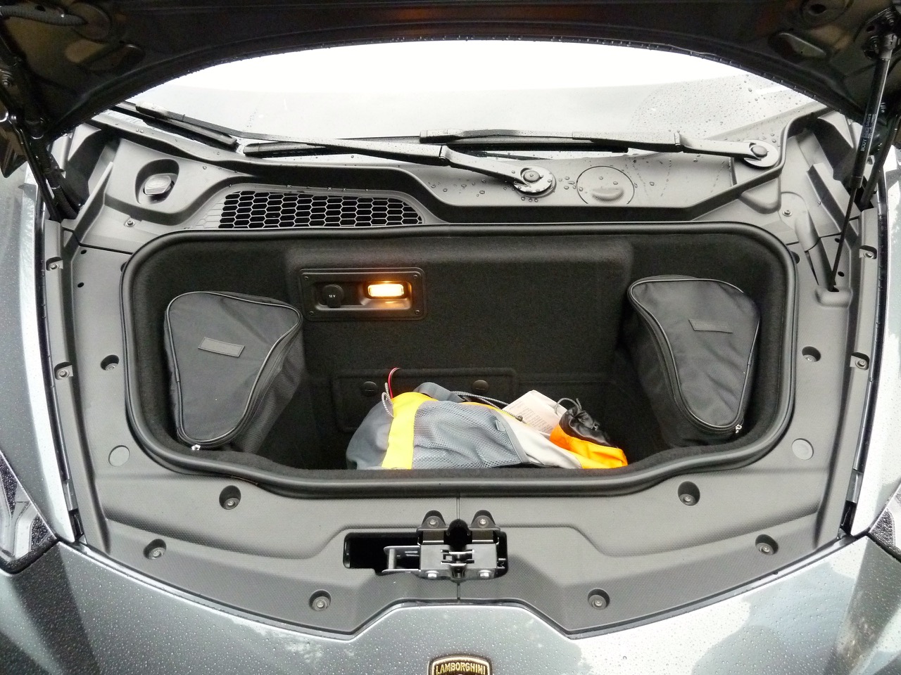 Le coffre est donné pour 150 l: 100 derrière le moteur, 50 à l’avant, partiellement occupé par le « kit de survie » (nan, pas un