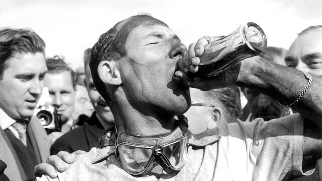 Stirling Moss aimait le coca cola ! Ci-dessous exténué après un run en Maserati 250F en 1956 quand il était pilote d'usine Formule 1 pour Maserati :