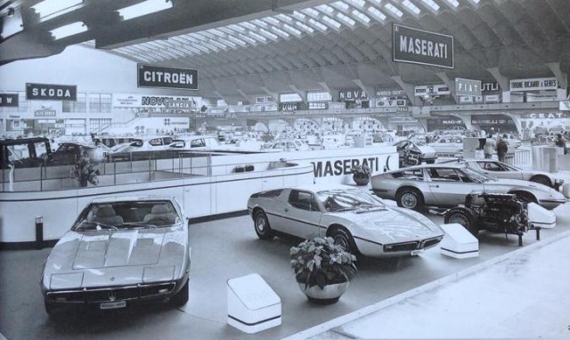 La gamme Maserati est absolument somptueuse au salon de Turin 1972 où l'on embrasse avec délice, de gauche à droite, la Ghibli I (Giugiaro pour Ghia), la Bora (sortie en 1971, Giugiaro pour sa propre société ItalDesign), l'Indy (Vairo pour Vignale) cachant la toute nouvelle Merak (Giugiaro pour ItalDesign) :