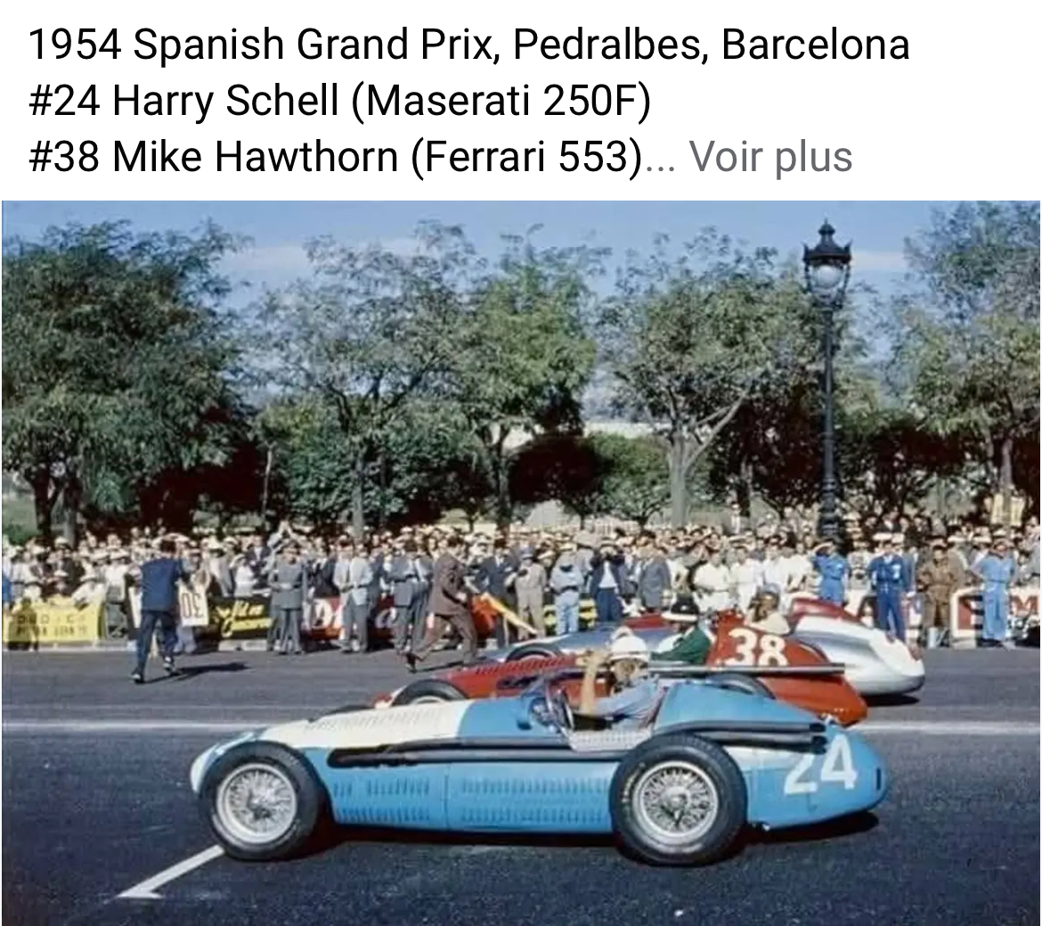 La Maserati 250F numéro 36 est pilotée par l’argentin Roberto Mieres qui abandonnera sur rupture de transmission . Devant lui la Ferrari 625 numéro 44 de Maurice Trintignant, futur vainqueur de l’épreuve. Au fond garée devant la gare, la Mercedes numéro 2 de Juan Manuel Fangio qui abandonnera sur rupture de transmission. Au premier plan la Gordini numéro 10 de Jacques Pollet qui se classera 7ième.