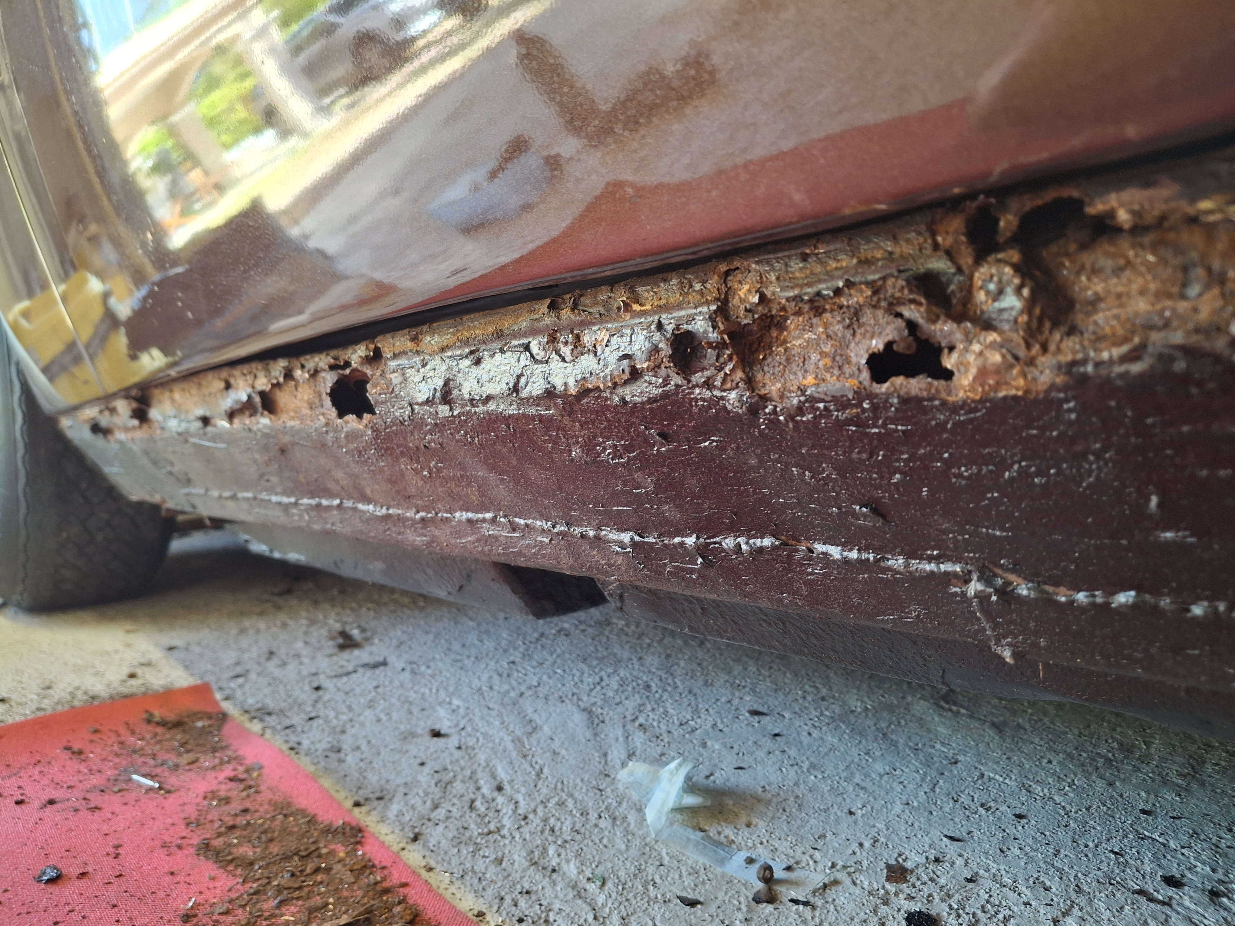 Les bas de caisses sont très abîmés et sont fortement oxydés avec de multiples perforations. Plusieurs reparations bâclées successives sont visibles. D'après ce que j'ai pu lire, Maserati dans les années 70 ne traitait pas à la peinture les bas de caisses et le dessous de leurs fabrications avant la pose du célèbre goudron que l'on retrouve partout sur leurs voitures.....Quand l'humidité trouvait son chemin à travers ces couches de bitume elle avait tout loisir de s'y installer et de corroder inexorablement toutes ces tôles.L'endoscope m'a montré qu'à l'arrière des bas de caisses la tôle est saine....ouf.