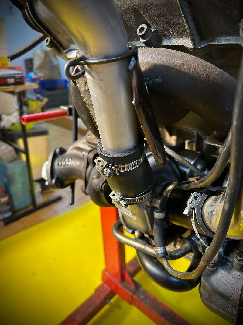 Ci-dessous on devine la Waste-gate coincée entre le moteur et le turbo (les turbos droit et gauche sont quasiment identiques avec la waste-gate sur la gauche du turbo, donc coincée entre le turbo et le moteur du côté droit). L’orientation du tube qui monte l’air comprimé à l’échangeur est un peu différente sur le côté droit et nécessite un écran de protection thermique par rapport à l’échappement :