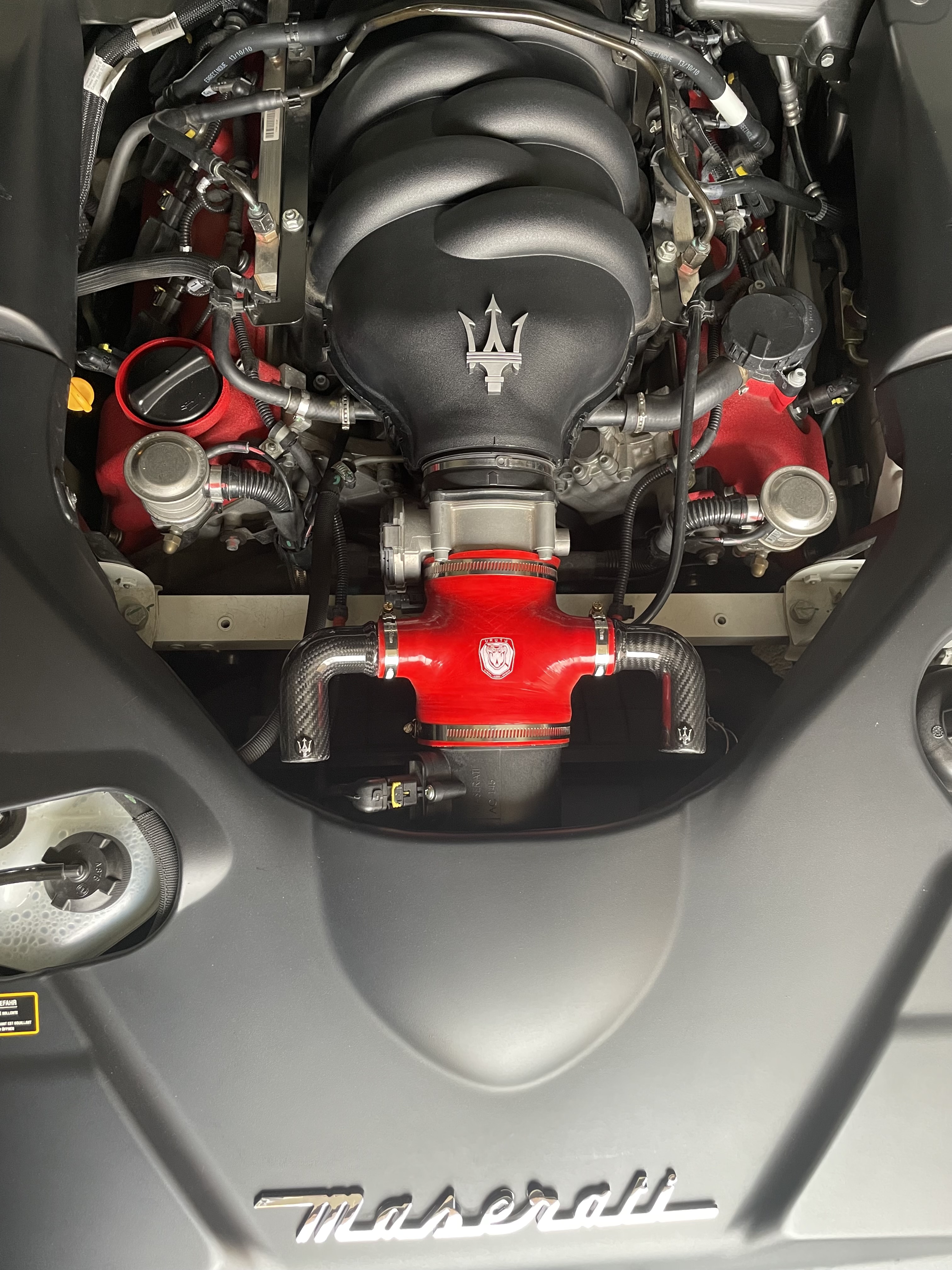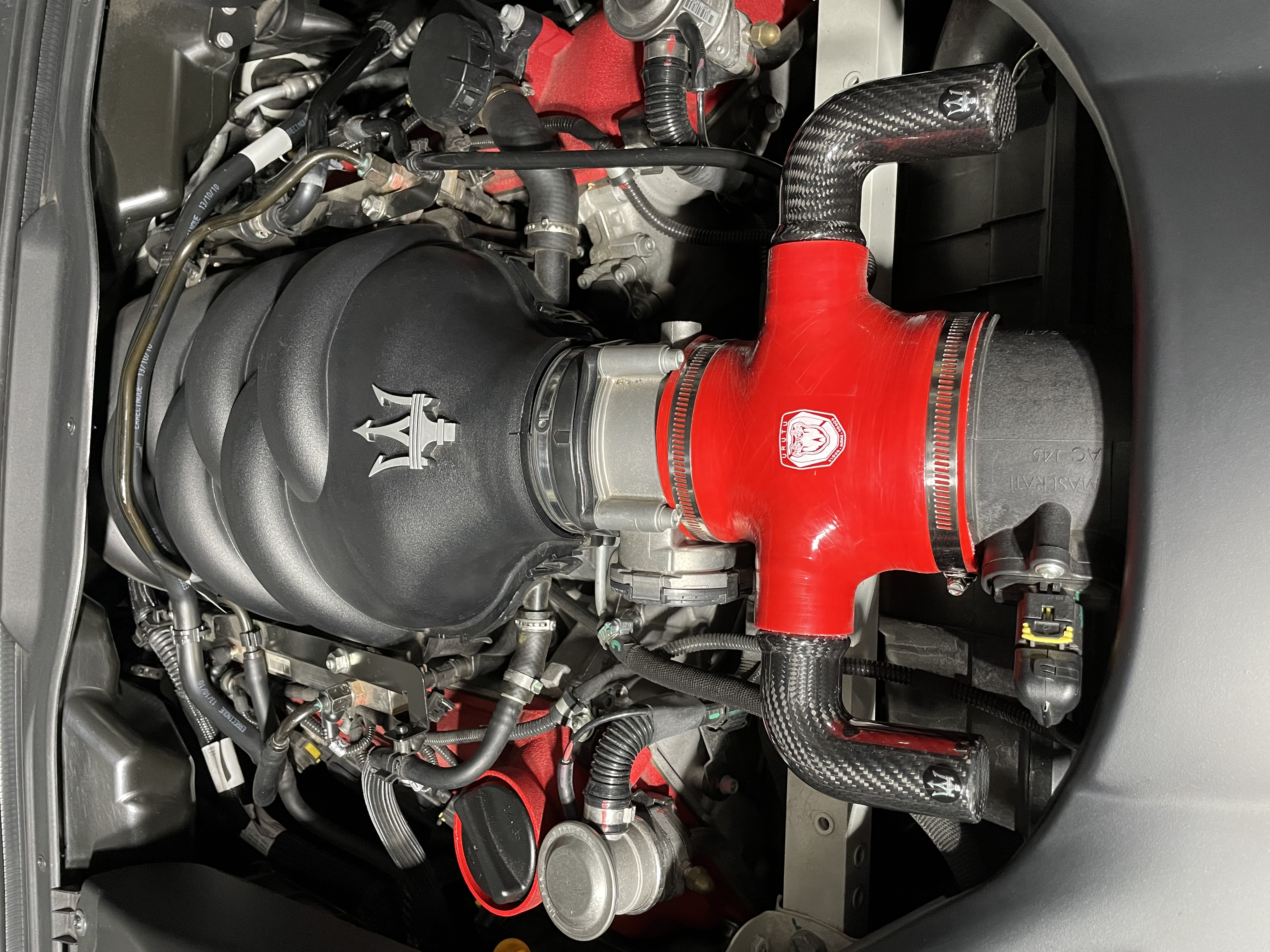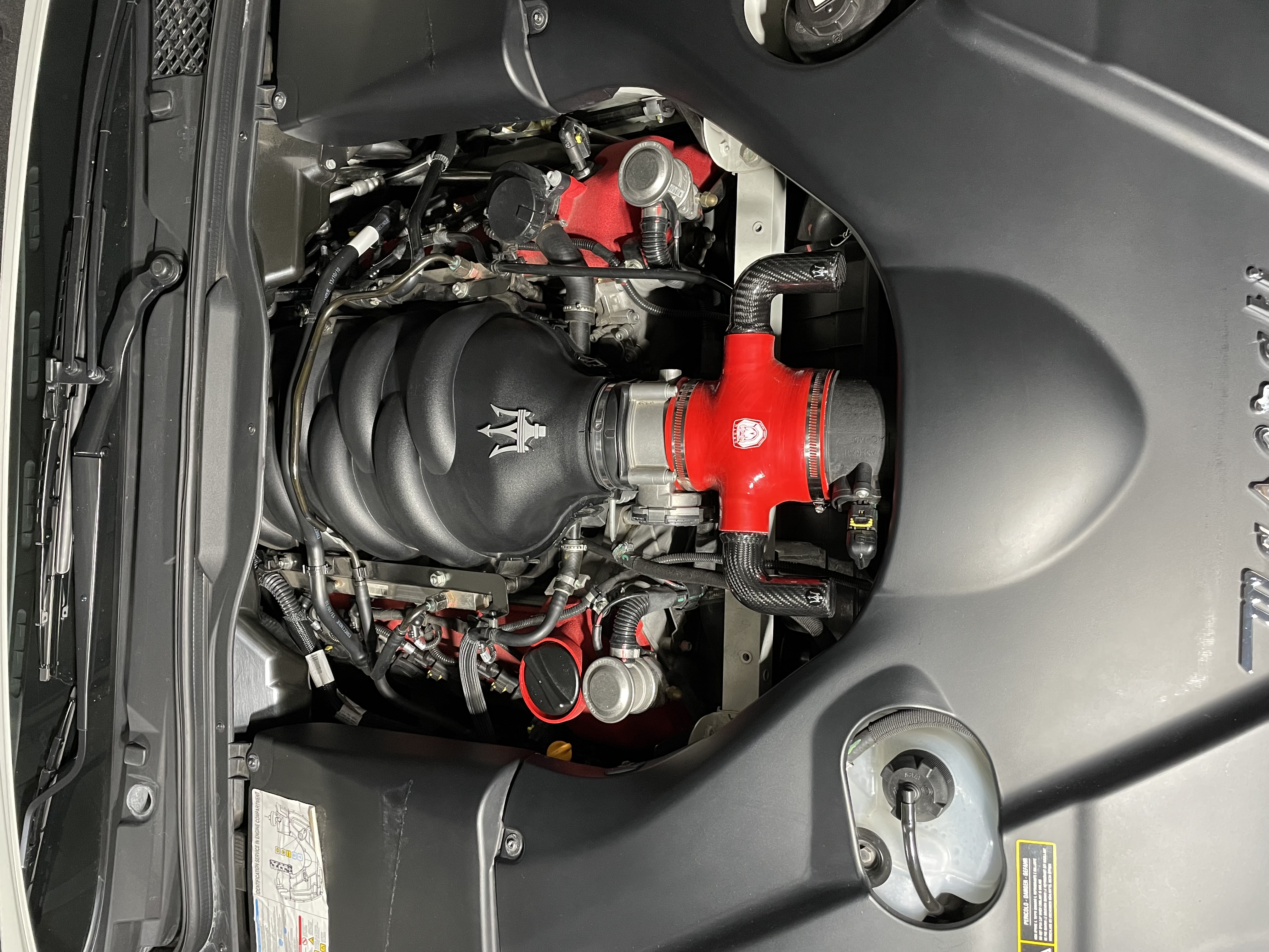 Et puis la modification de l’entrée d’air que je trouve esthétique, entre la durite silicone rouge qui rappelle le coloris des couvres culasse, et les résonateurs carbone, avec le logo Maserati, je trouvais l’ensemble sympa.