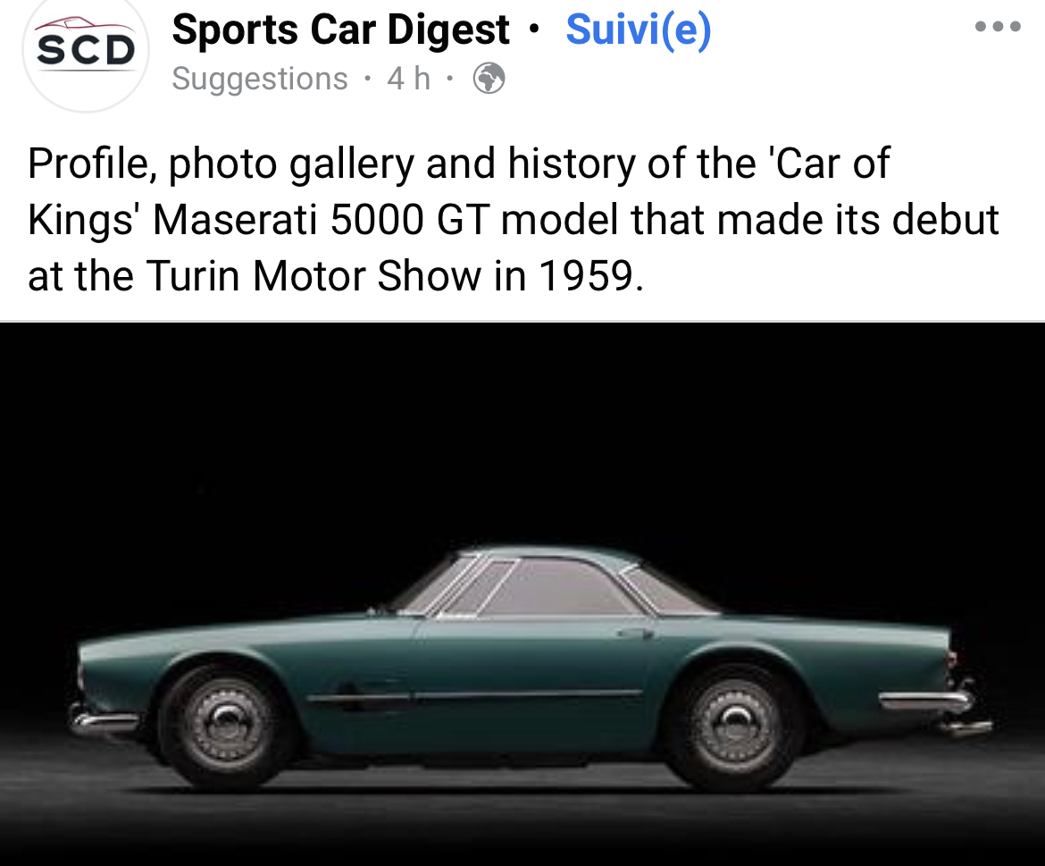 C’est vrai qu’elle est sublime la Ghibli. L’évolution stylistique entre le début et la fin des années 60 est incroyable. Je pense que dans l’histoire de l’automobile, c’est le moment où le changement a été le plus rapide. Dire que la 5000GT Allemano ci-dessous c’était 5 ans avant la Ghibli ! Certaines ont même été construites 1 an avant les premières ghibli de 1966 !