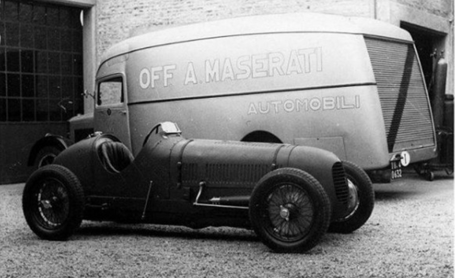 On voit au fond le transporteur et quelques autres voitures = il y avait 10 Maserati sur 21 partants à ce grand prix ! - Pas de date ni de détails pour cette photo trouvée sur Wikipédia, où semble figurer un transporteur Lancia. - Ici par contre, tout est écrit sur la photo = 4CM du record de kilomètre lancé en 1100cm3, battu sur l' Autostrada Firenze-Mare en 1934 par Giuseppe Furmanik = 222.634 km/h
