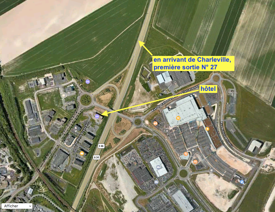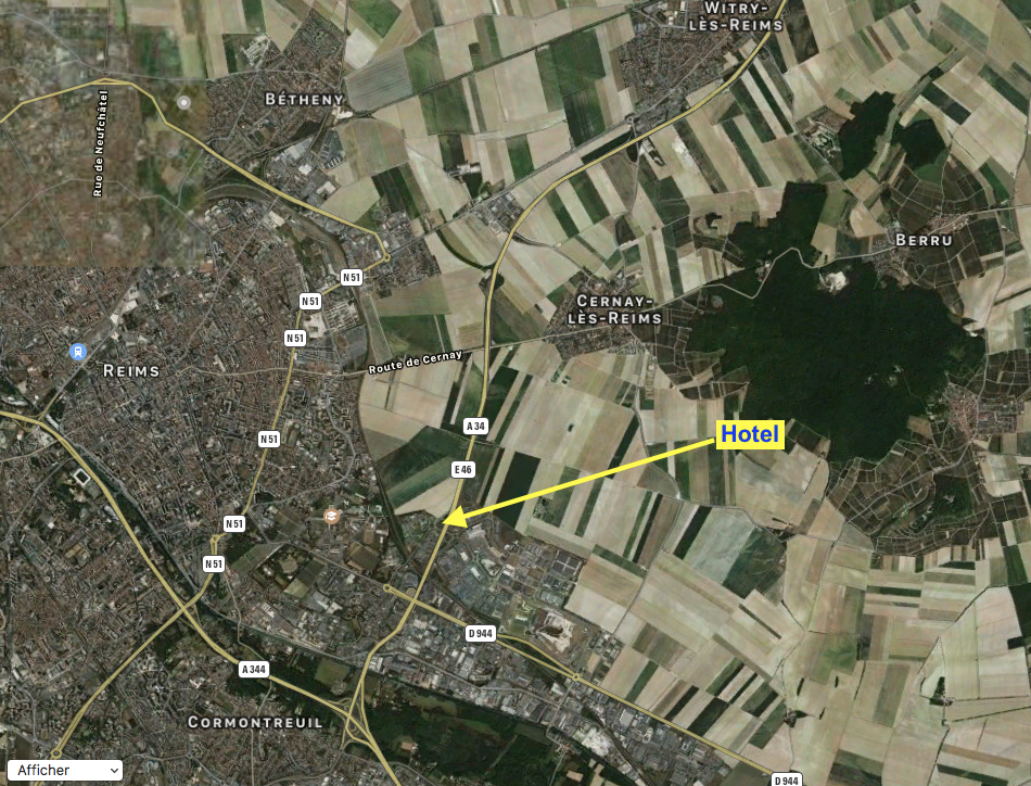 Charleroi, Charleville-Mézières, Reims, et en arrivant à Reims sur l'A34, première sortie N°27 Croix Blandin, l'hôtel est juste là, visible...