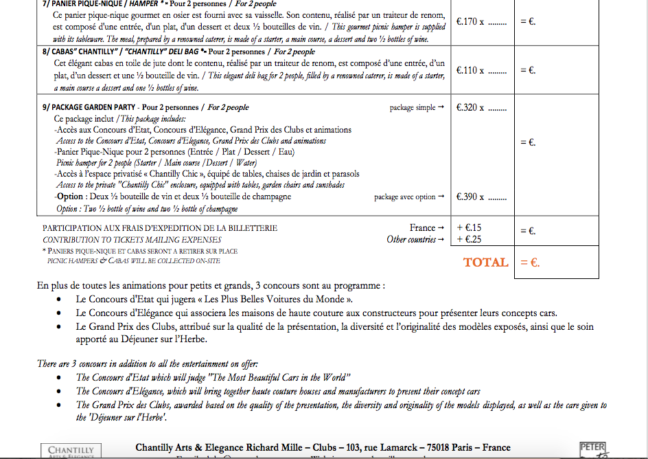 Je vous passe les options (chapiteau 5x5 = 2000€, paniers picnic 170 pour 2, c’est pire qu’au Mans.. mais il y a cabas à 110..