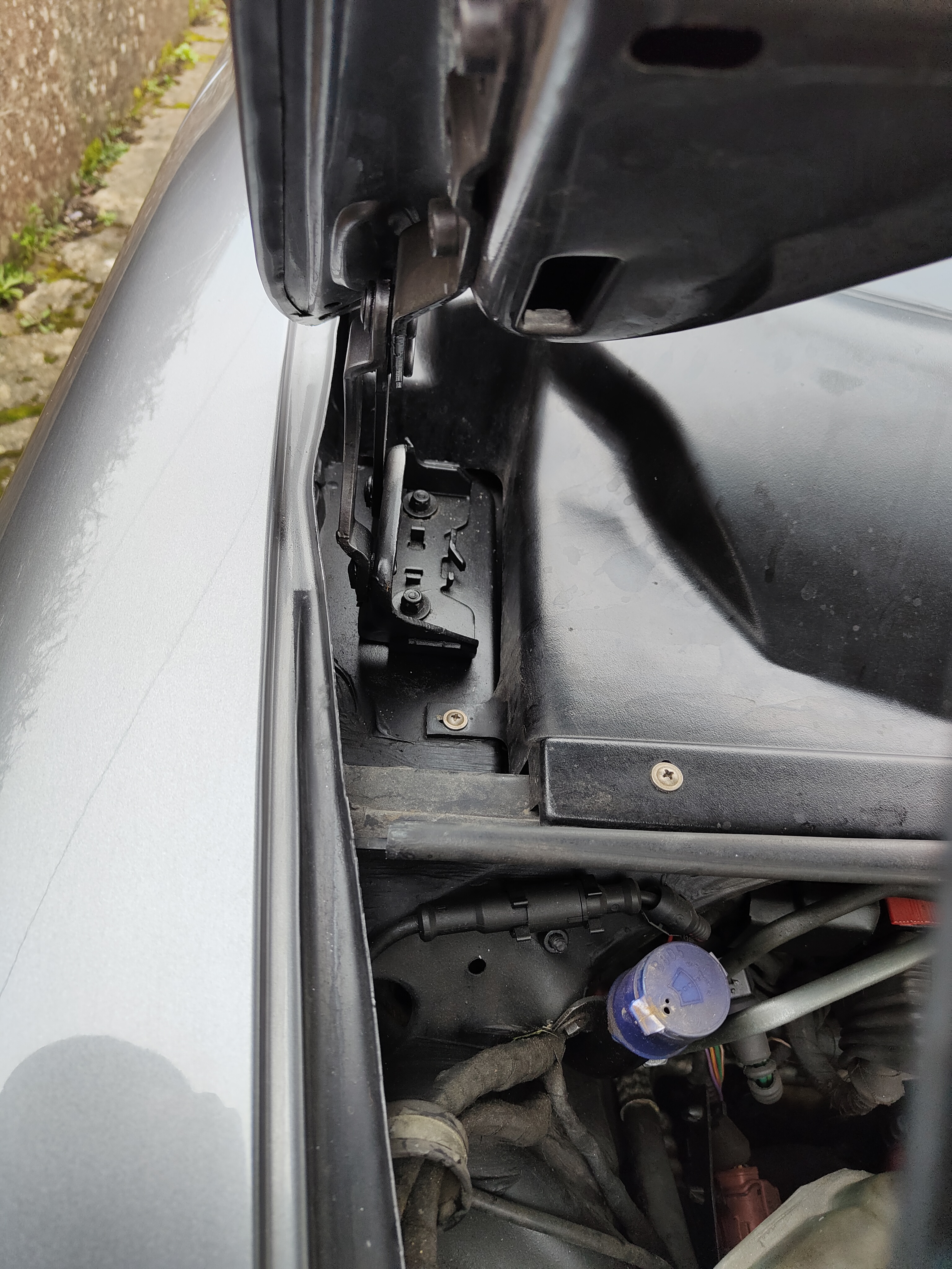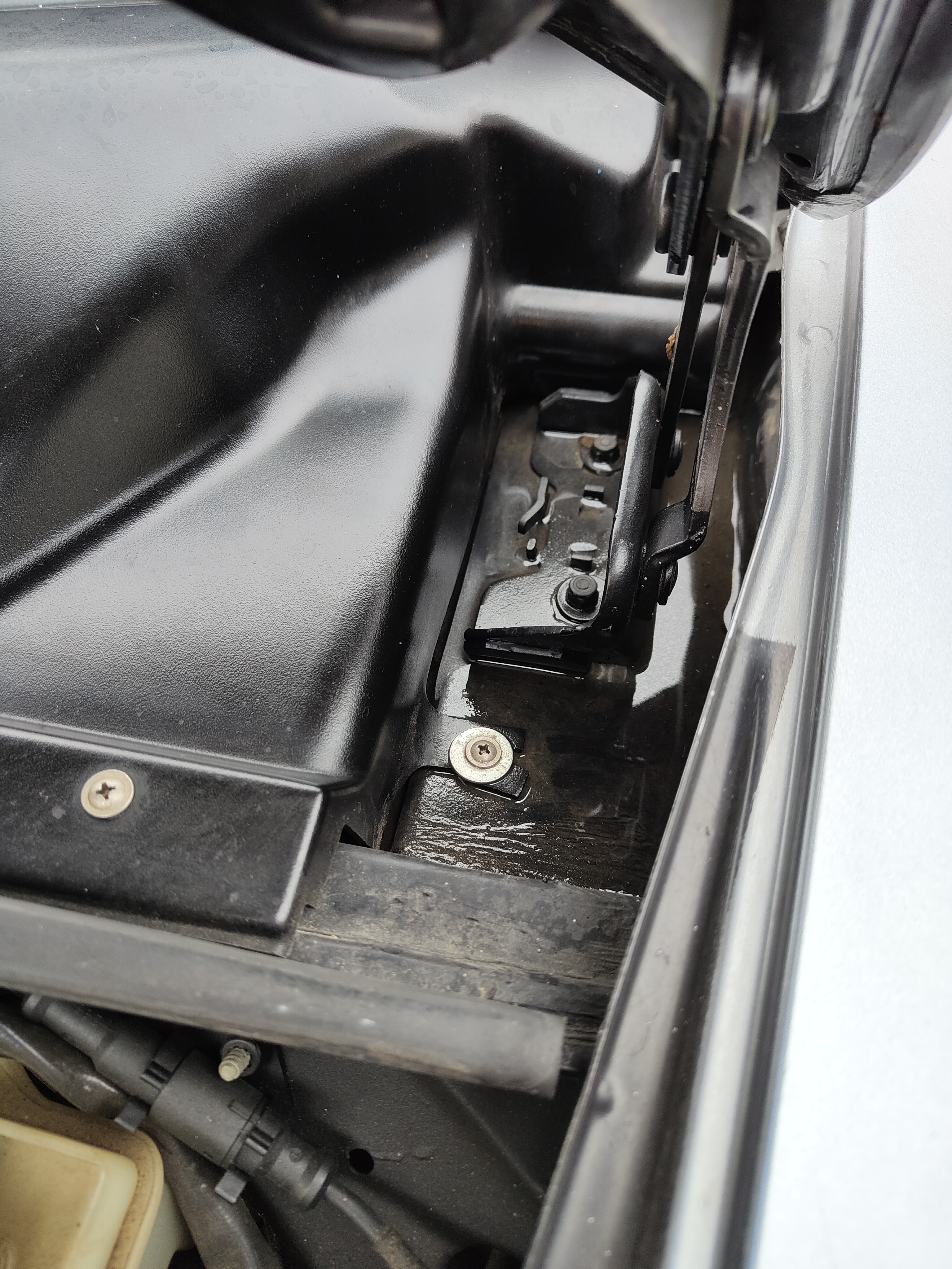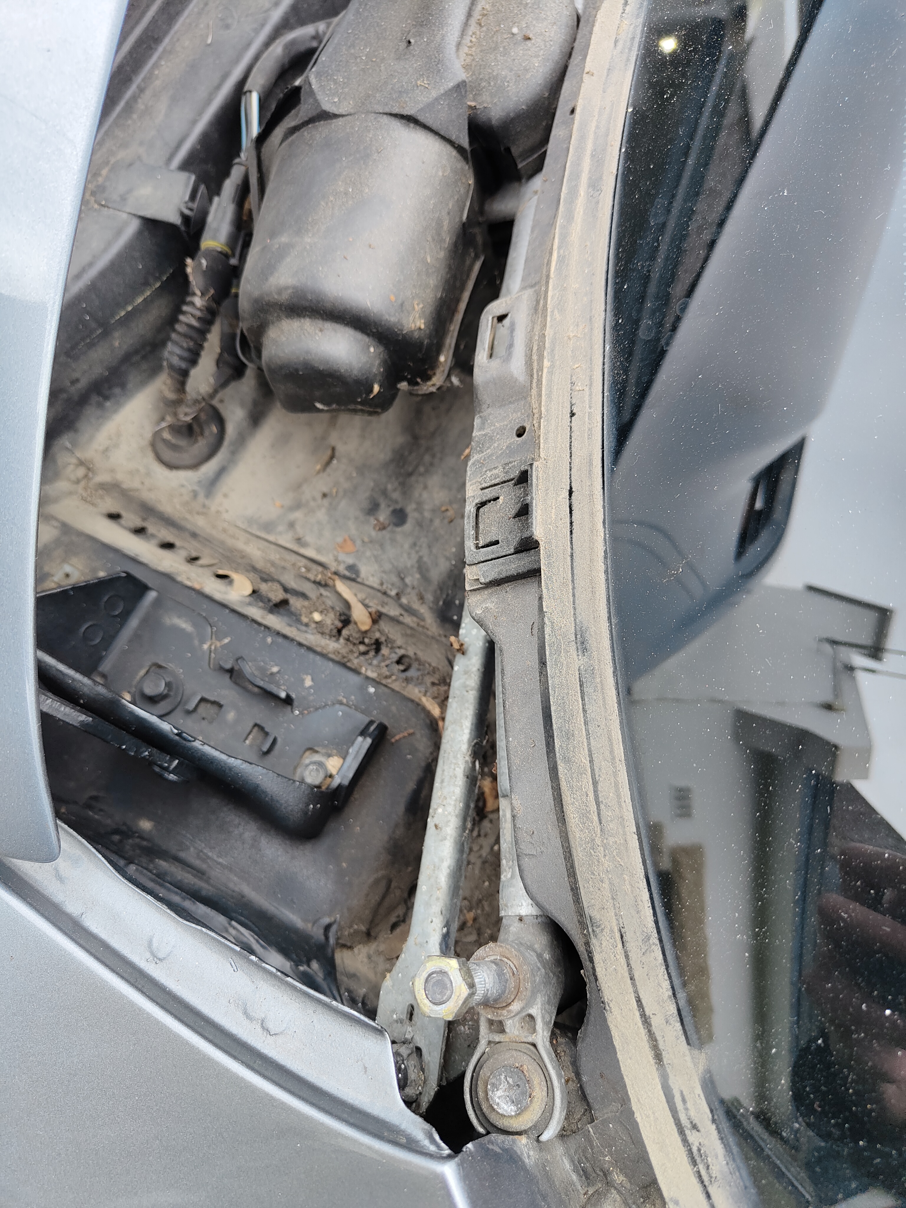 Vous en conviendrez, que j'ai pas eu le temps de monter la nouvelle, il pleut 😭.. et quelle découverte cette eau au niveau des charnières, il y a plein de trous d'évacuation mais ils étaient tous bouchés ☹️.. donc gros nettoyage en perspective et révision/graissage de la mécanique essuie glace..