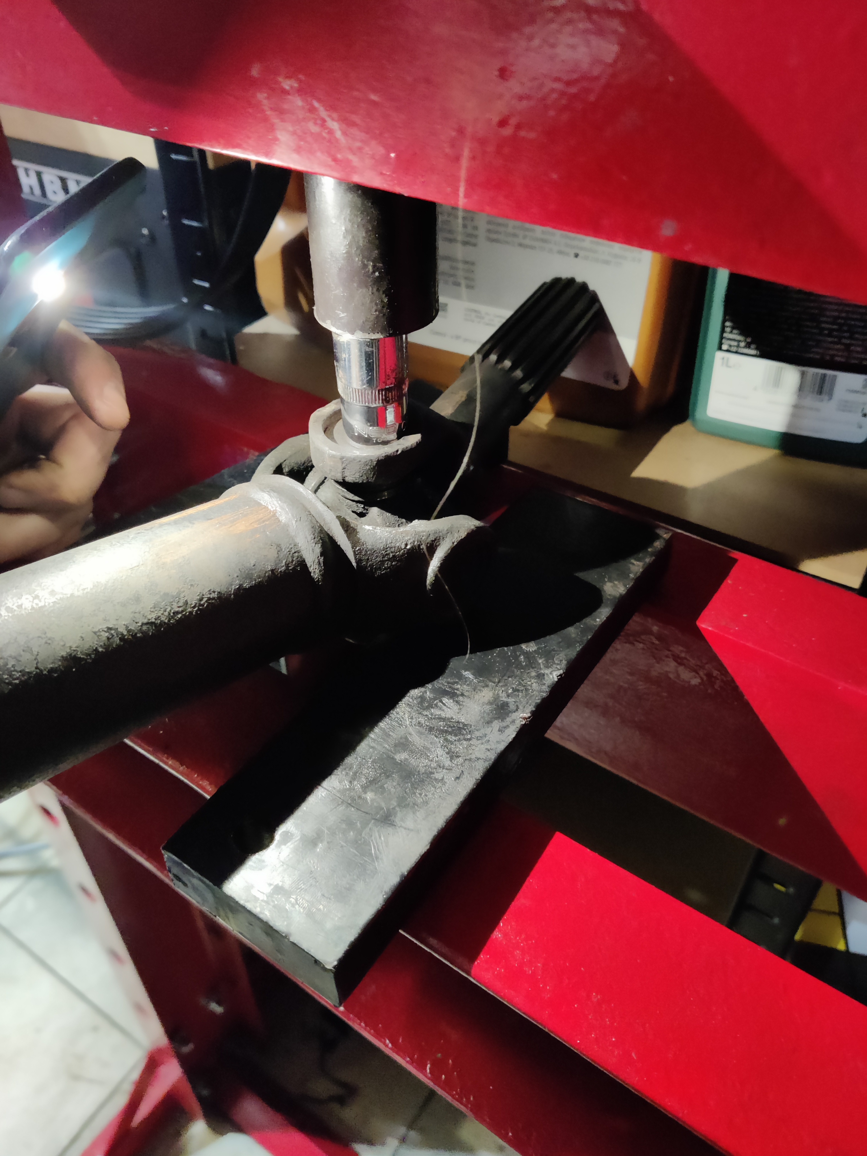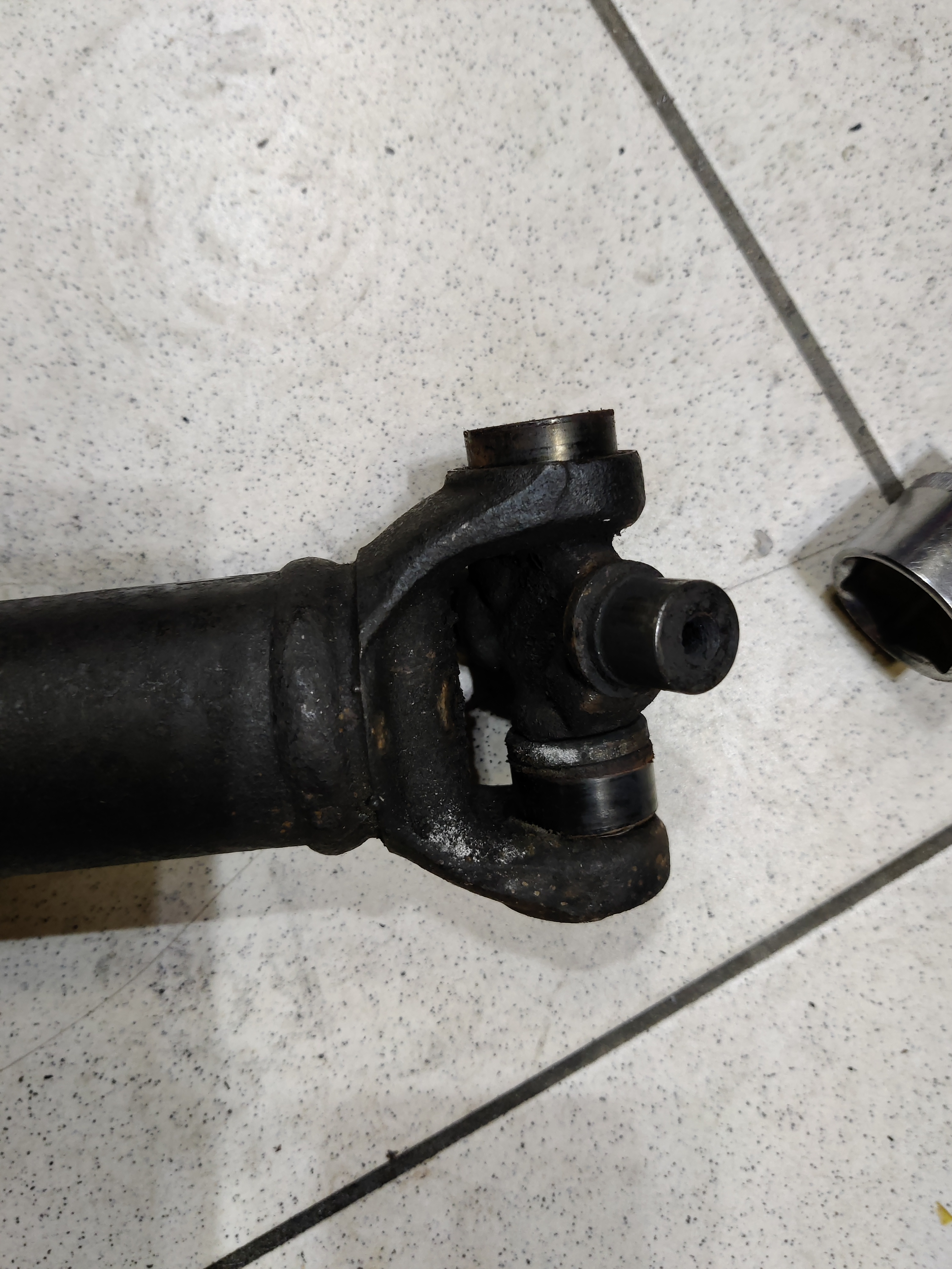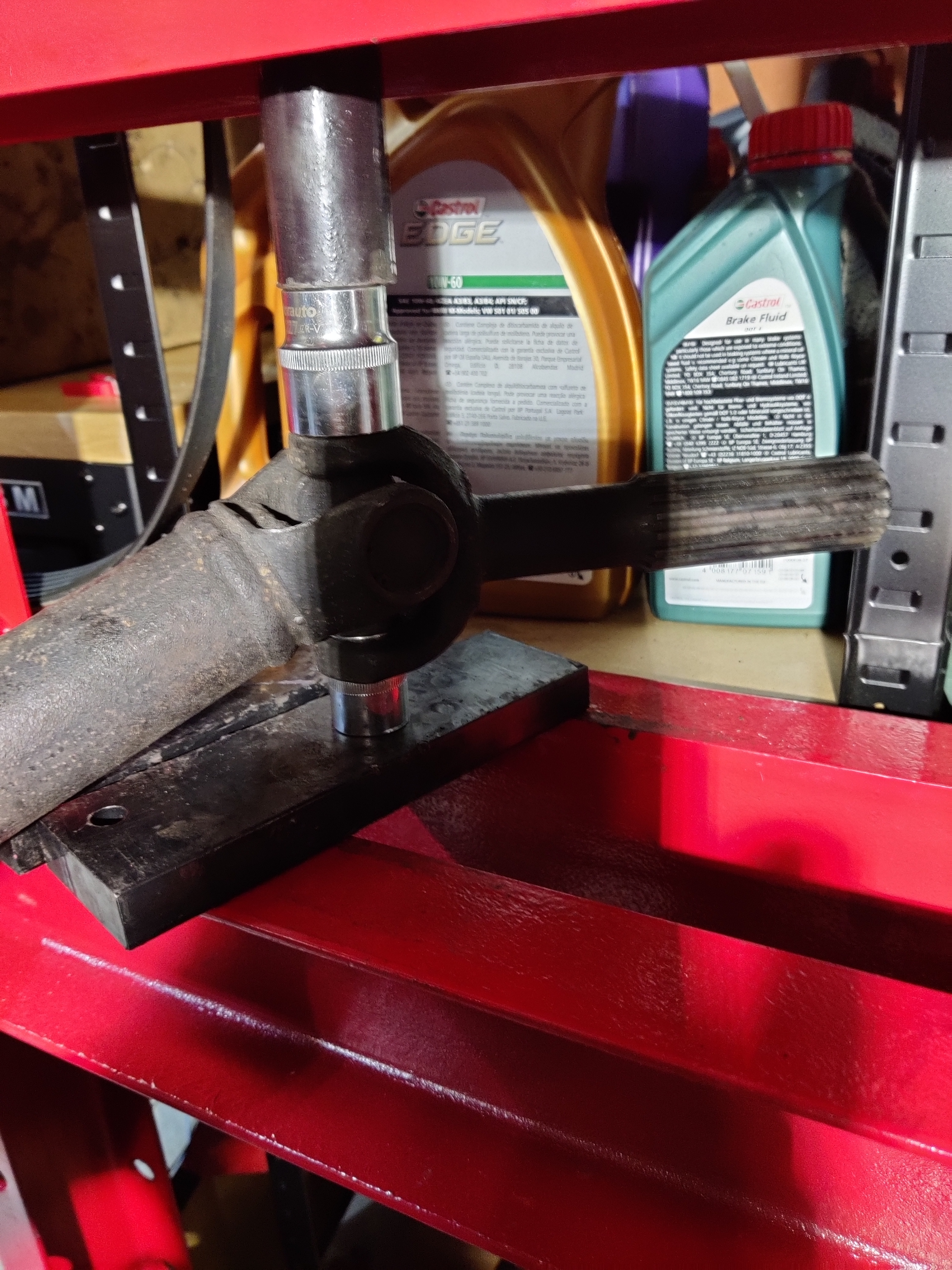 Reste à chasser le croisillon, il faut une presse, ça tombe bien, j'ai. Sur internet, vous voyez des gens faire ça avec un marteau ou autre (cherchez des vidéos u-joint replacement pour trouver), sur une maserati de 30 ans, vous pouvez oublier, sans presse, ça sera d'une galère sans nom (peut-être avec un étau, mais je doute)