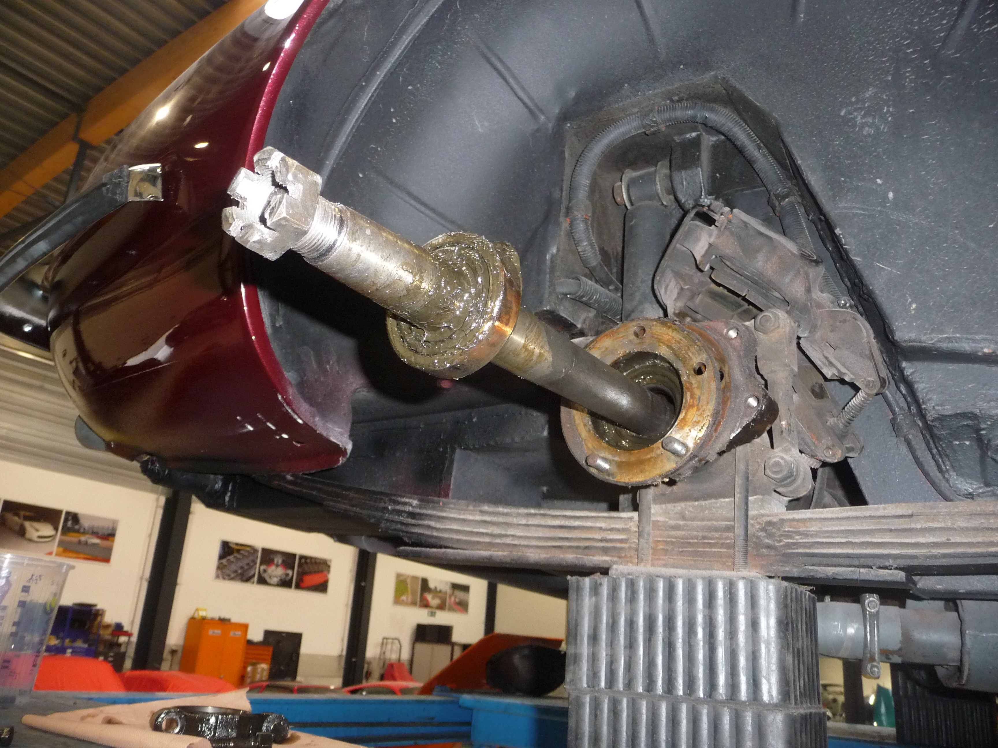 Véhicule sur ...le pont, avec roues AR, disques, moyeux démontés et demi-arbres sortis pour dégager le diff: