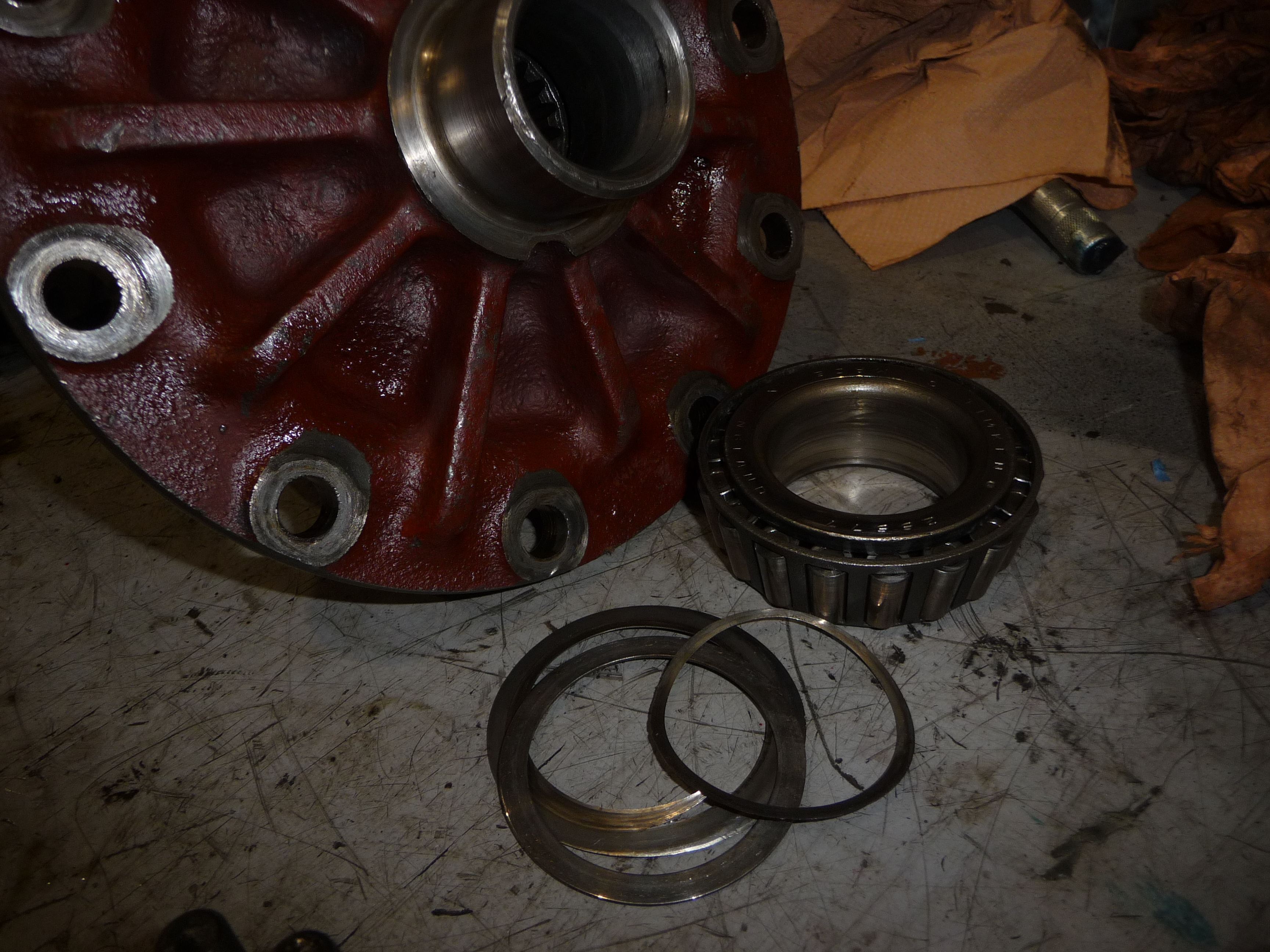 Le roulement conique (ici démonté) qui devait s'appuyer via une portée arrondie directement sur l'axe du disque a en effet été monté en s'appuyant sur plusieurs rondelles plates (évidemment très abîmées), peut-être pour corriger le jeu latéral, alors que ce jeu doit être compensé par de telles rondelles à l'extérieur du roulement!: