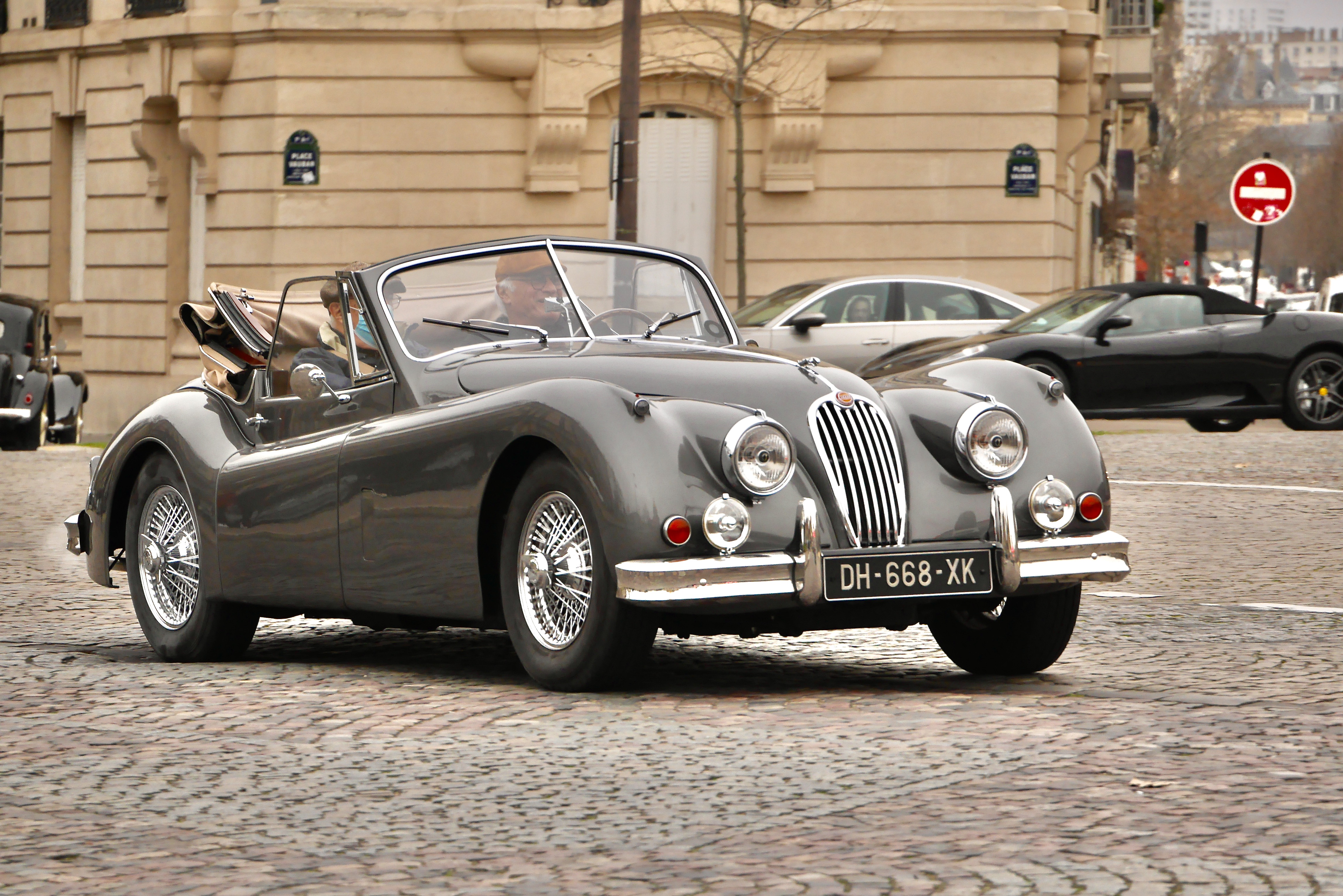 Encore une belle XK140 à coté d'une Dodge Charger de bons sentiments