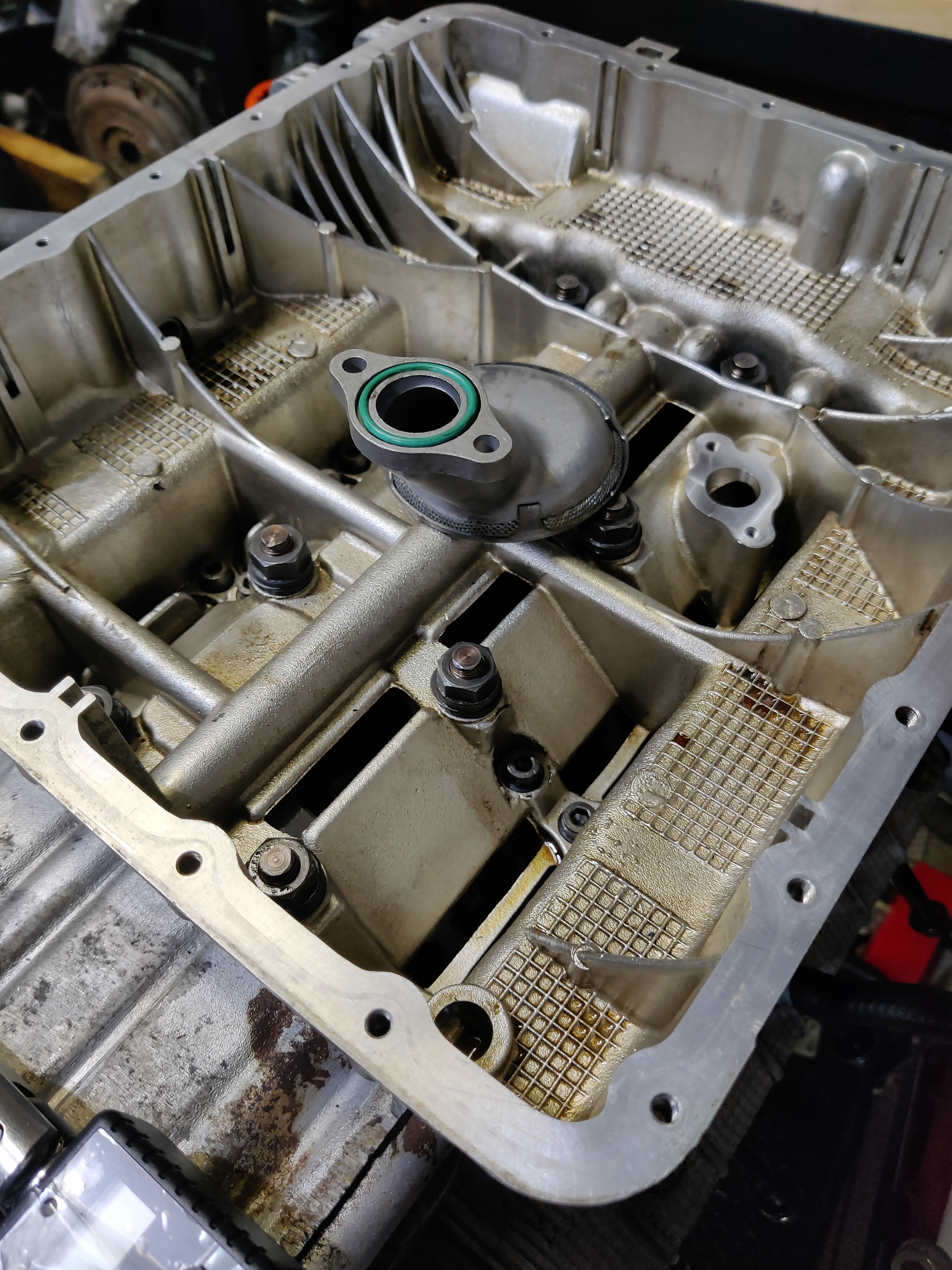 MIse en place de la pipe de succion d'huile avec son nouveau joint (j'ai plein de joints, faut que je les utilise. Je ne remercie pas maserati d'ailleurs, tout est en vrac dans la boite, débrouille toi pour trouver quoi va où).