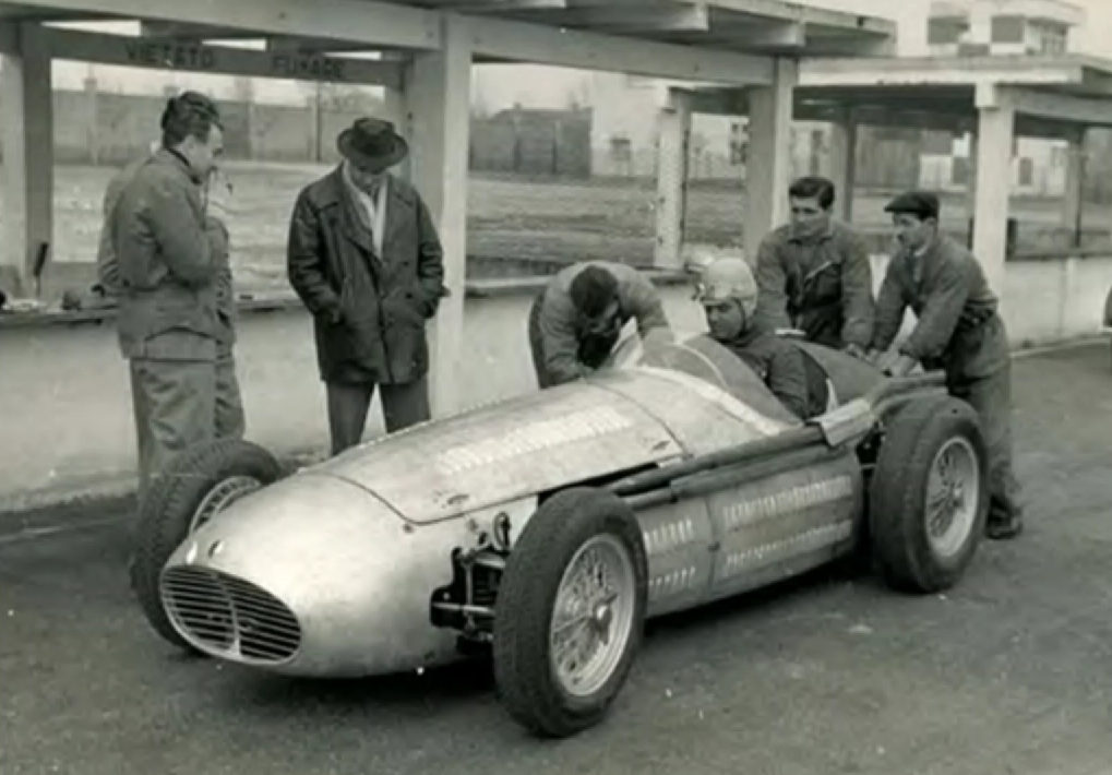 Ermanno Cozza et son mentor Antonio Reggiani assurèrent ainsi le réglage et le début de rodage du moteur de la première 250F au banc d’essai le jour de Noël, le matin du 25 décembre 1953. Puis le moteur fut monté dans l’auto # 2505 l’après midi du 25 décembre. Il faut préciser que les 250F portant les numéros 2501 à 2504 sont des A6GCM interim transformées en 250F. La première vraie 250F est la # 2505. Les toutes premières mises au point châssis-suspension de ce nouveau bolide furent effectuées par le fameux « collaudatore » (pilote d’essai) Guerino Bertocchi sur l’Aerautodromo di Modena le 26 décembre 1953, jour de la San Stefano qui est habituellement férié en Italie :