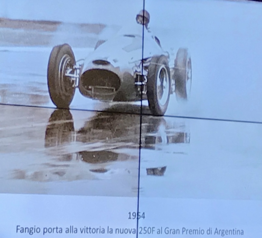 Ci-dessus une photo inédite de Fangio remportant sous la pluie avec la première 250F le Grand Prix d’Argentine 1954, photo de la collection Orsi présentée lors d’une conférence d’Adolfo Orsi Junior en 2018 à Modène. Grazie Adolfo ! J’avais photographié l’écran et je n’étais pas dans l’axe, excusez la déformation.