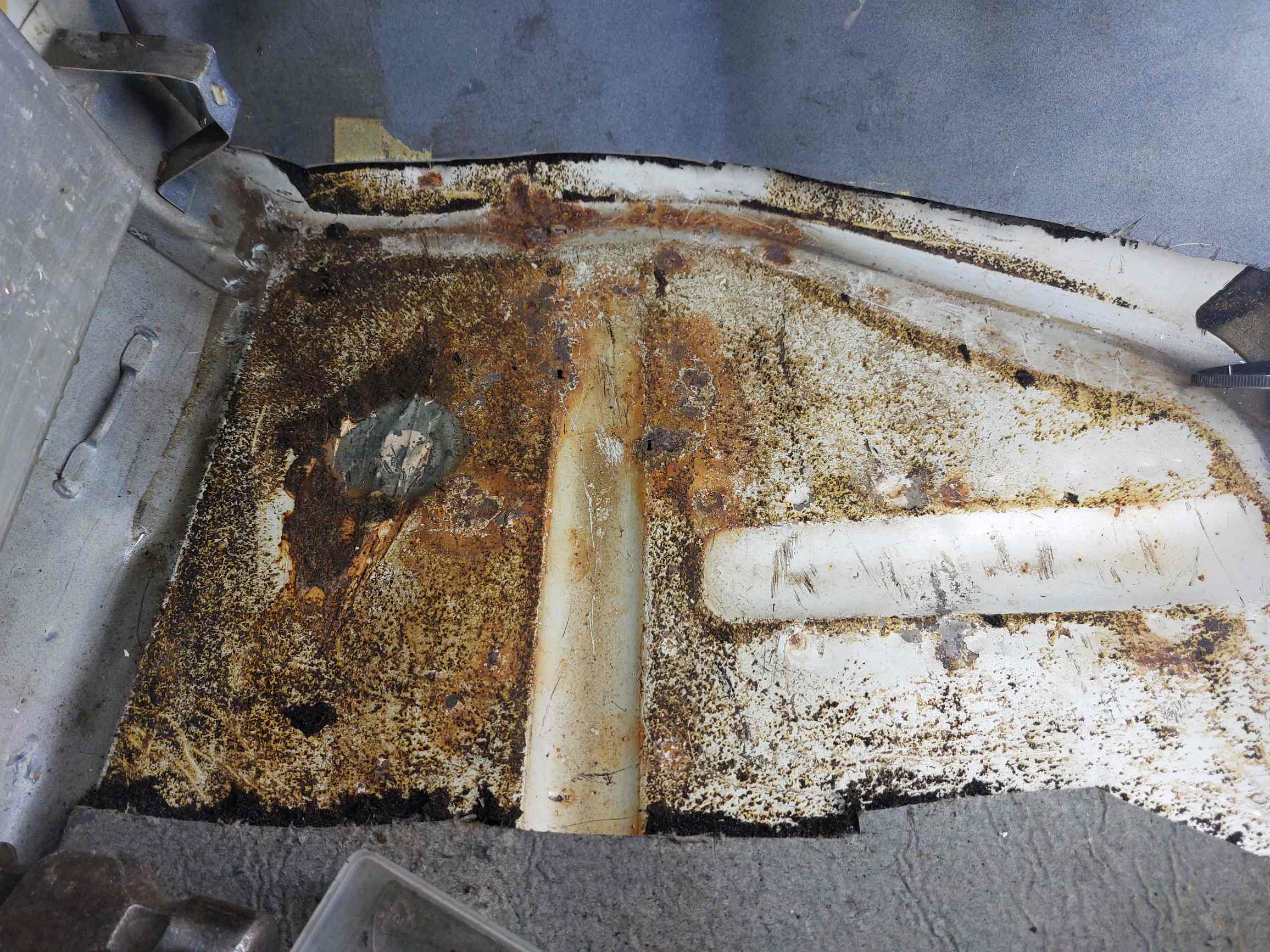 Voilà un plancher pourri, le trou fait la taille de mon pied. Sur une Mustang de 65