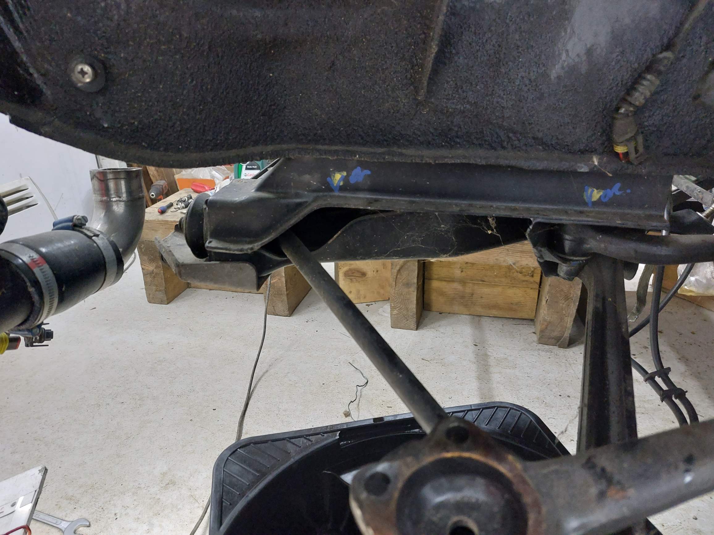 J'ai pris la sage décision de démonter l'intérieur pour vérifier l'état de la caisse avant d'assembler le nouveau moteur (un 2.5 24v). Sage parce que la caisse s'est avérée être assez pourrie malgré la peinture refaite, une jolie couche d'antigravillon et des tapis pas trop moches. J'en parlerai plus tard.