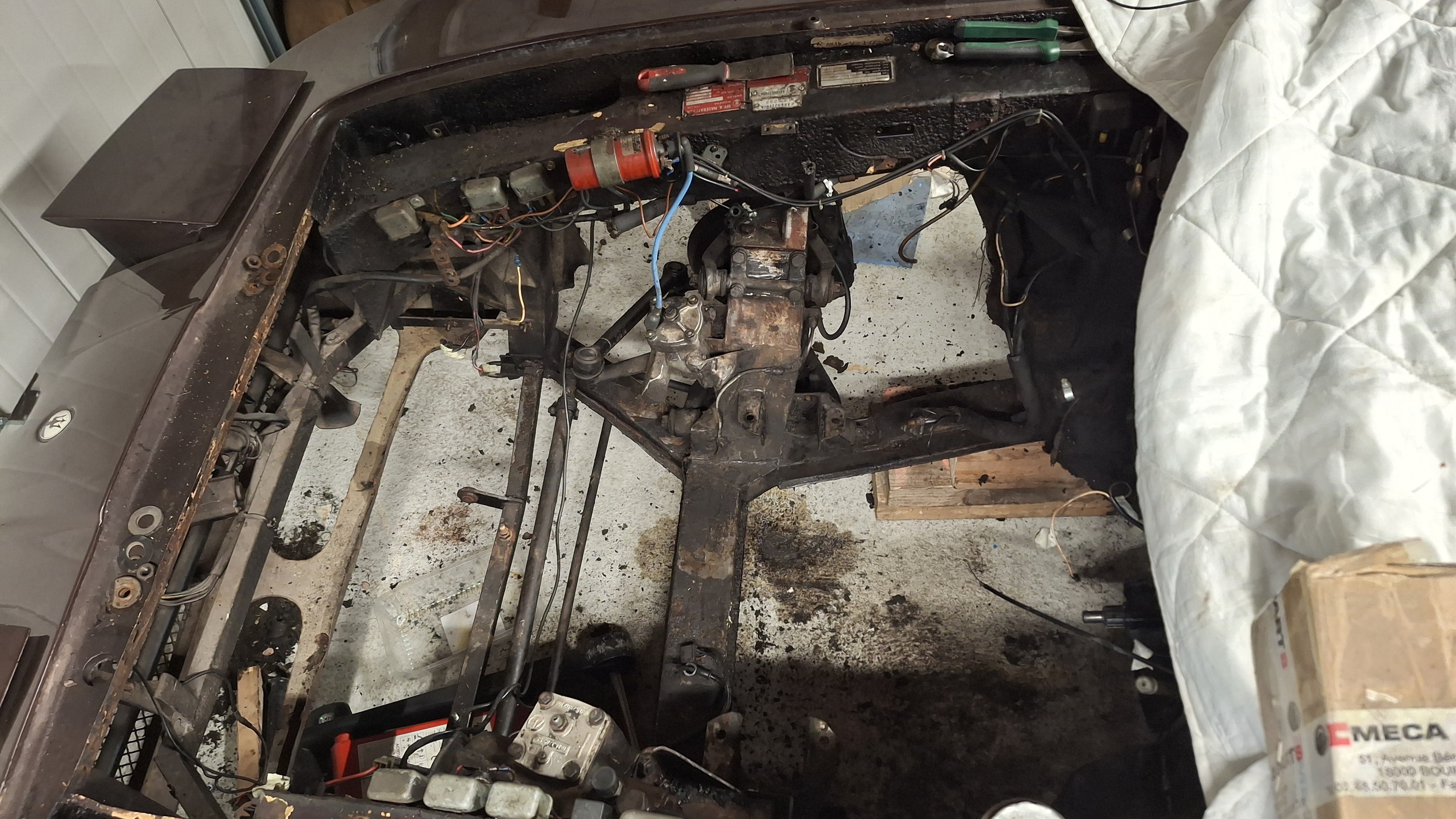 Je pense également, vu la configuration "moteur déposé" retirer tout le train avant pour refection dans de meilleures conditions, ce qui me permettra également de bien refaire le compartiment moteur.