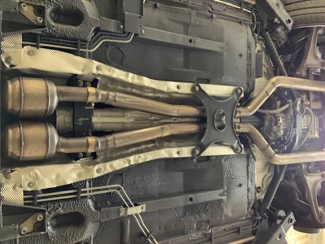 Le schéma issu d'Eurospare montre un silencieux central (schéma du coupé GS, il ne semble pas y avoir de spécificité sur le spyder malgré la différence de longueur du châssis). Sur ma ligne d'échappement, j'ai l'impression qu'il y a des tubes à la place de ce silencieux, ce qui ne ressemble pas au schéma. La sonorité n'est a priori pas vraiment différente d'un modèle d'origine. Ces tubes sont pourtant estampillés Maserati avec un numéro de pièce d'échappement Maserati ..... je m'y perds un peu !