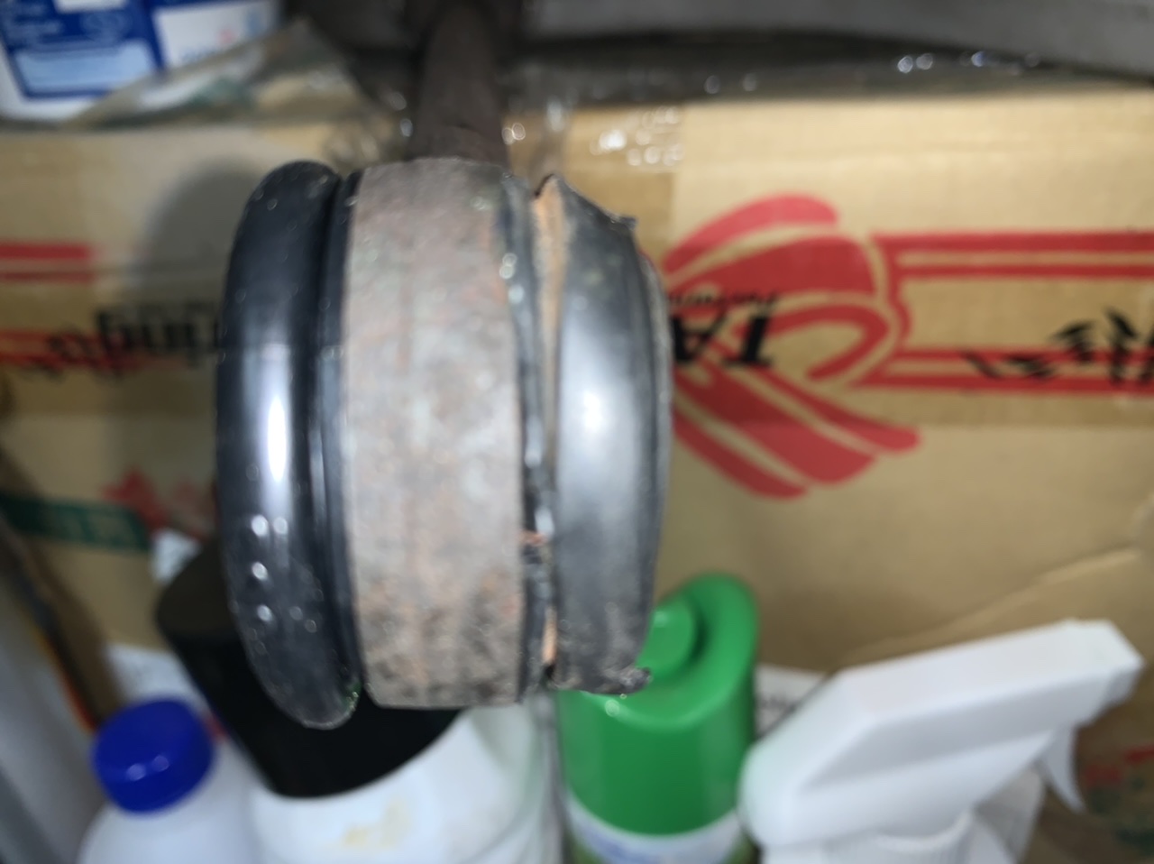 On rentre par un trou sur le côté et en bas, et il s agit de faire basculer le cache sur toute la tête de la rotule par un trou de moins de 1cm... :? Et ben ça passe ! On tire comme un bourrin, j ai utilisé les outils à côté le bleu et le tournevis. Aucolun dommage et même pas besoin de collier :lol: