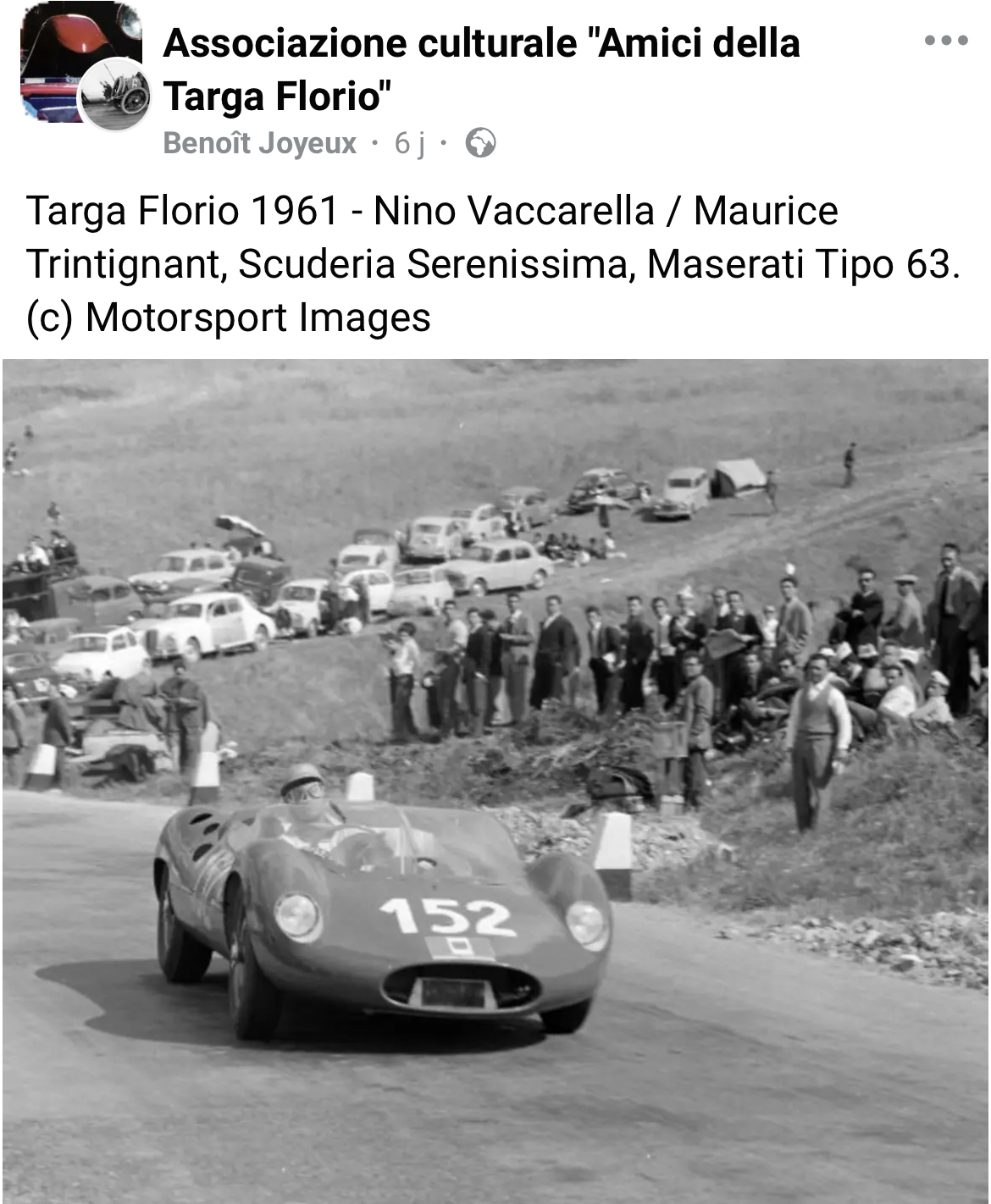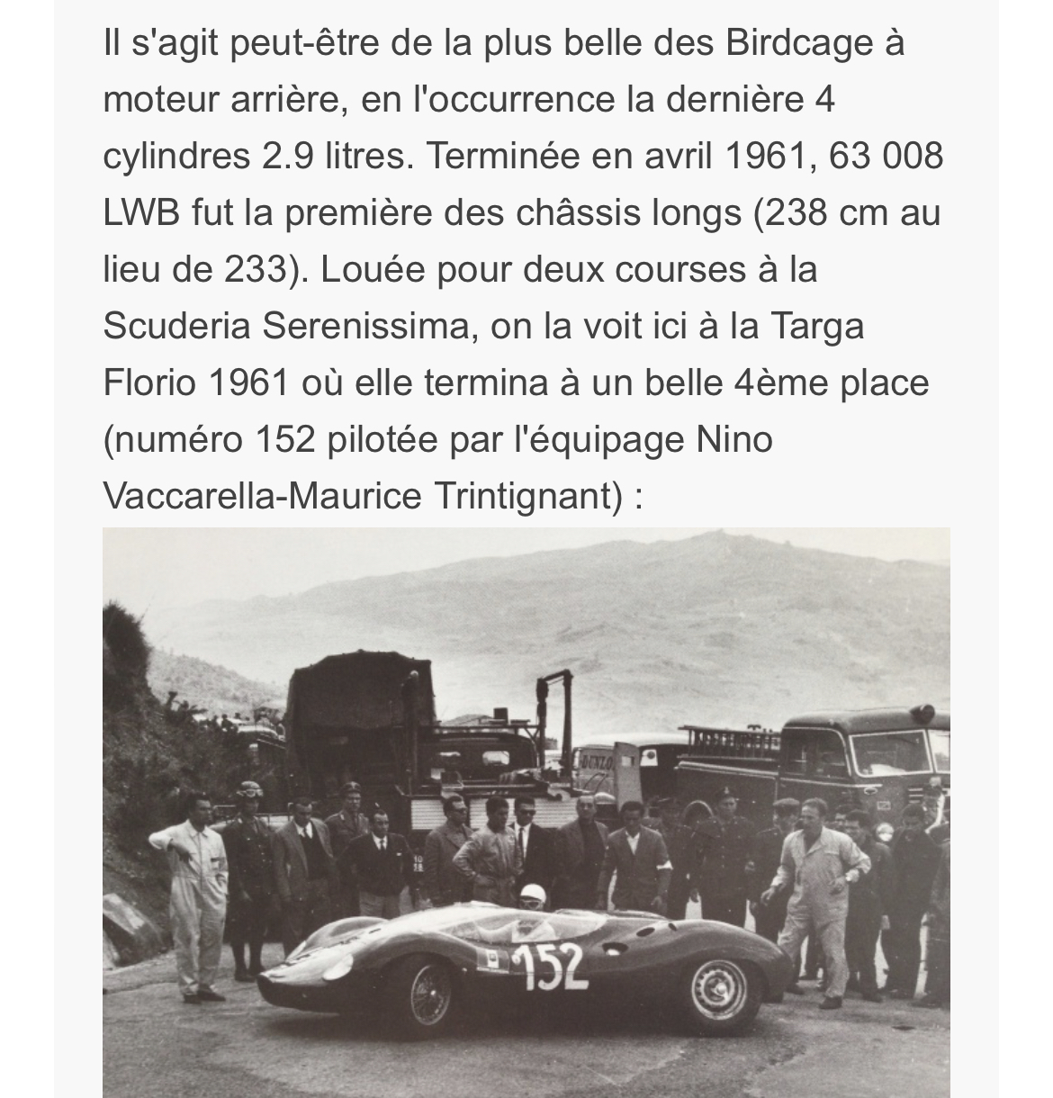 Nino Vaccarella à la Targa Florio 1961 sur Birdcage Tipo 63.008 LWB. Son coéquipier Maurice Trintignant avec son couvre chef à carreaux :