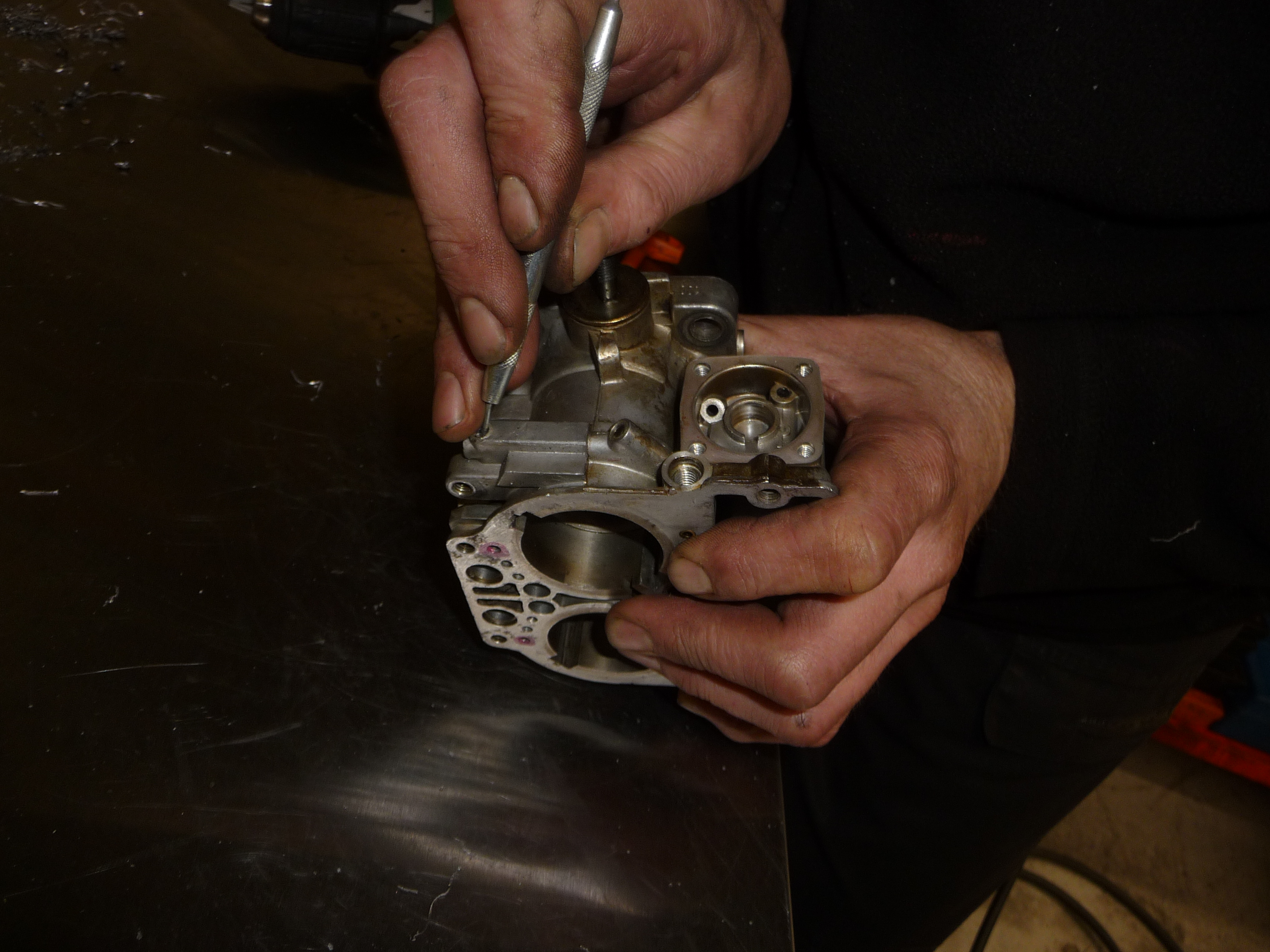 Travail de "débouchage" de conduits d'essence sur des Weber.