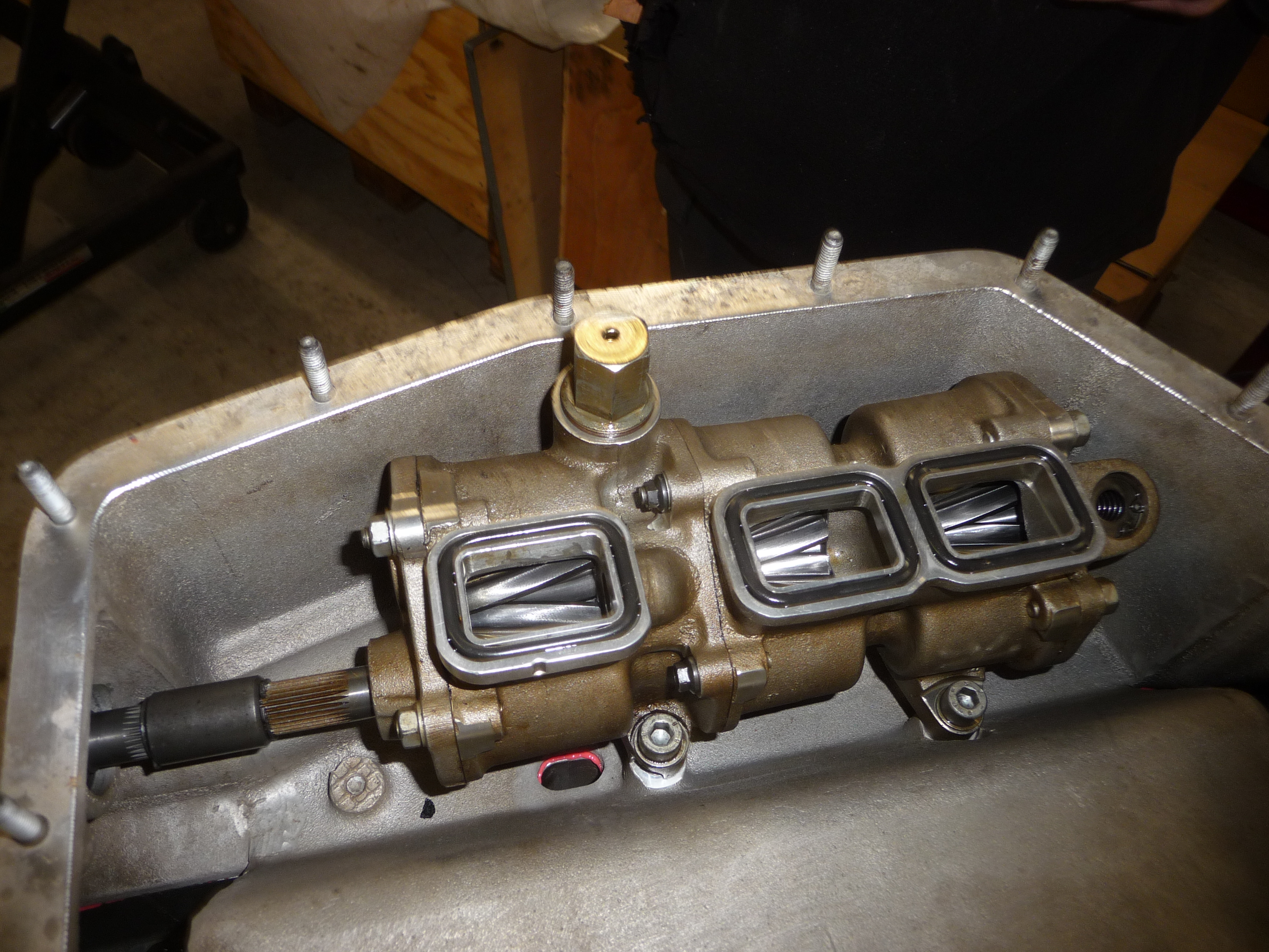 Détail des enroulements hélicoïdaux internes de la pompe à huile, et de son axe cannelé: