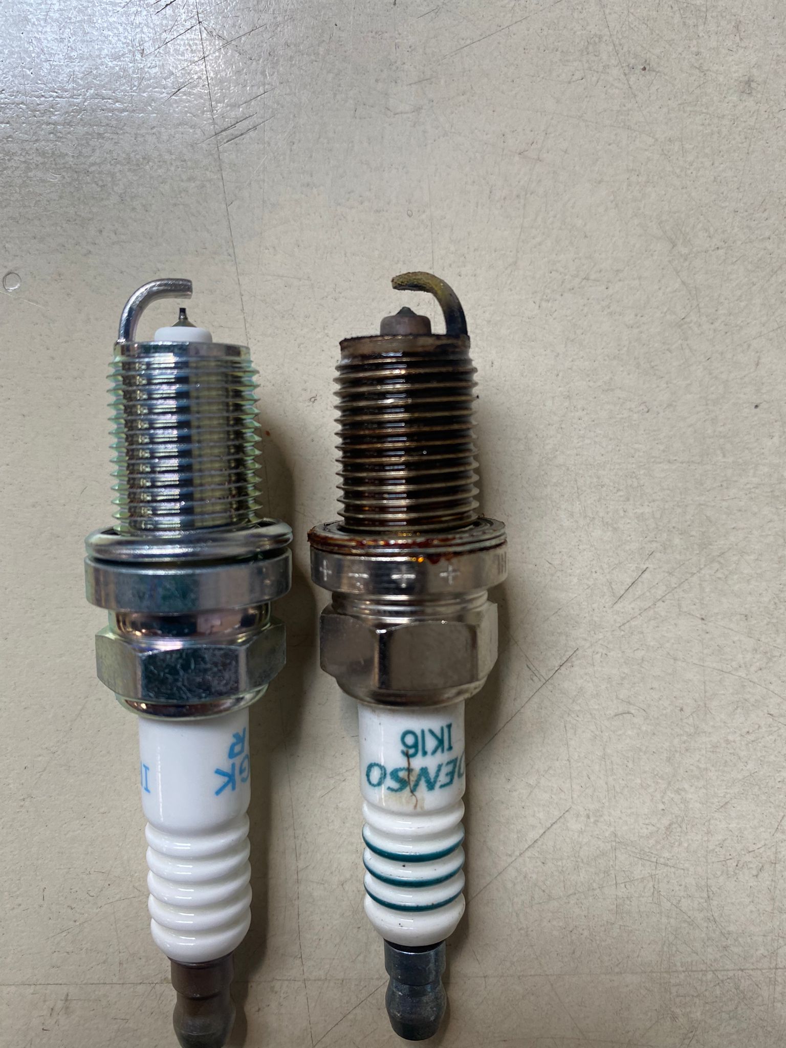Verdict sans appel. A droite bougie actuelle (d'ailleurs pas de la bonne spec, ce qui explique sans doute l'usure), à gauche bougie neuve: