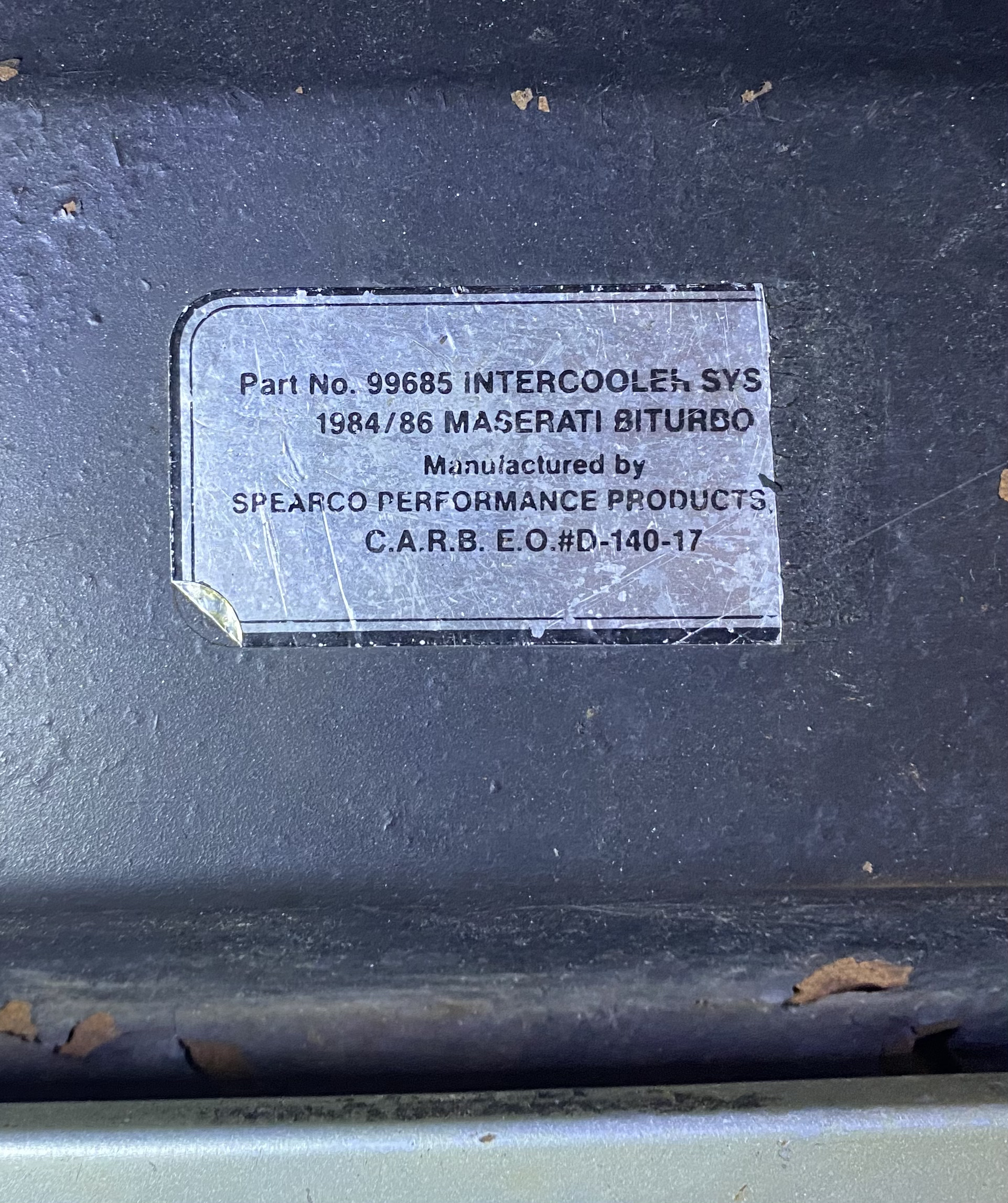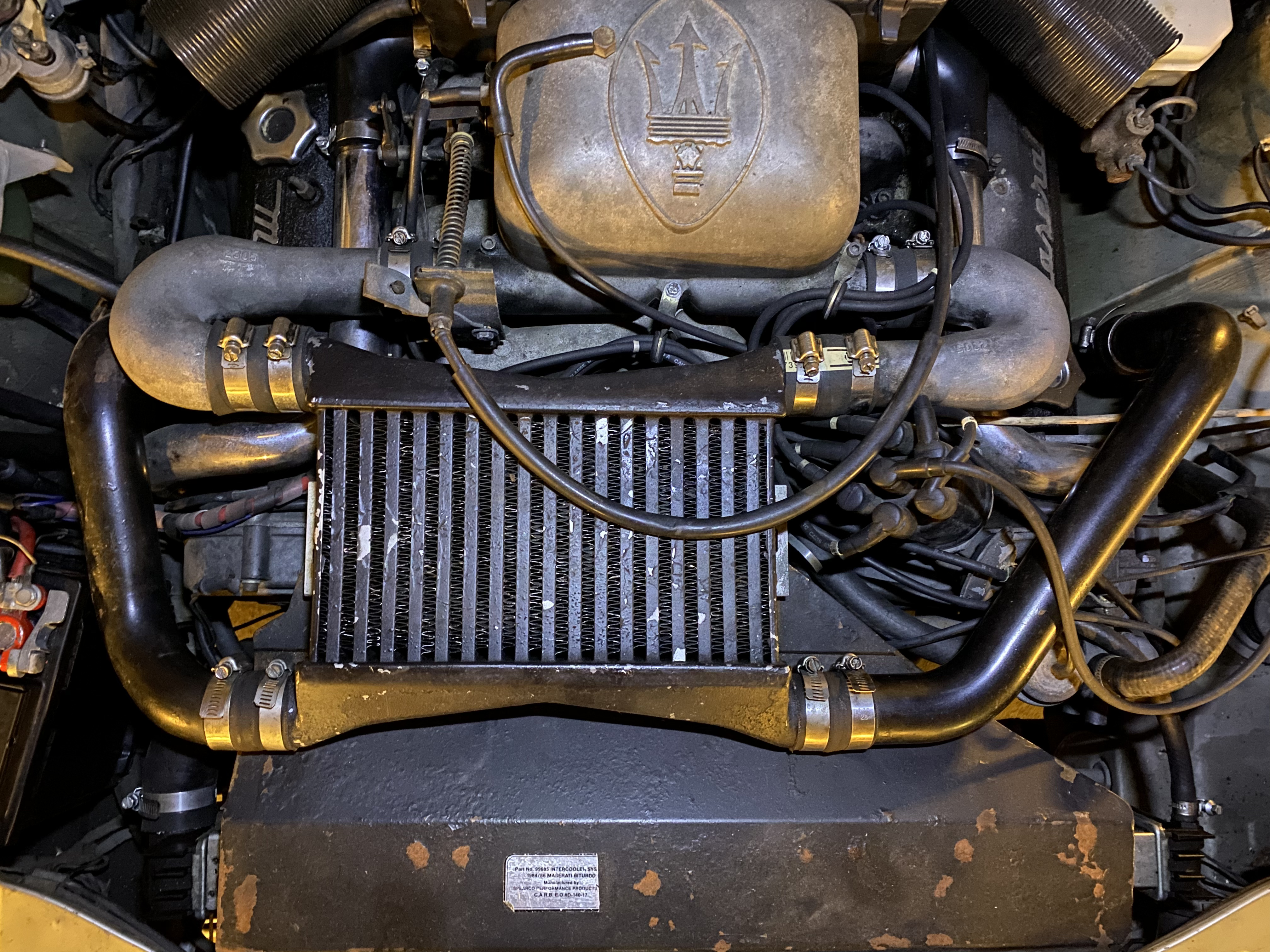 Pour compenser le lourd système de dépollution (tout un tas de tuyauterie supplémentaire, de pompe, d’admission d’air, pot catalytique, etc…), Maserati avait installé un intercooler air/air Spearco bien avant l’introduction d’intercoolers sur tous les modèles pour compenser la perte de puissance du 2.5