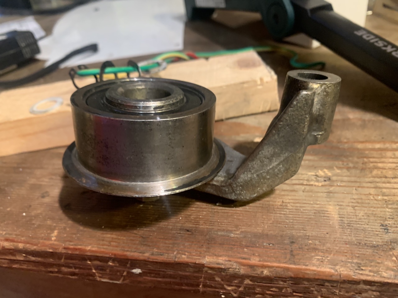 J avais commandé de quoi bloquer les poulies d aac. Impossible de les retrouver…. Une heure… Bon, et alors cette poussière de métal… et bien le galet de roulement doit être monté avec l épaulement cote moteur… Et la.. on voit bien l usure