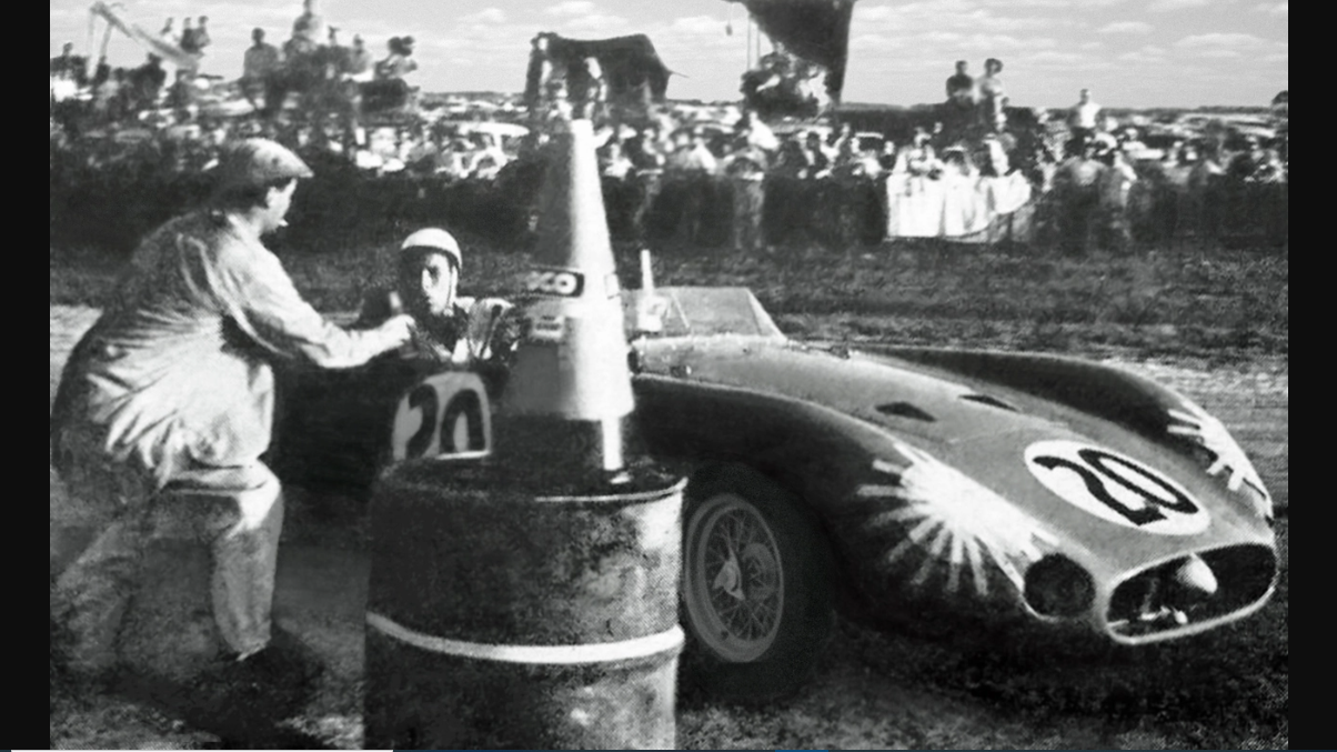 On en vient à la photo extraordinaire que je voulais vous présenter. En 1957, si Stirling Moss est pilote de Vanwall en Formule 1, il est resté chez Maserati en catégorie Sport. On le voit ci-dessous en Maserati 300S aux 12 heures de Sebring 1957 (en équipage avec Harry Schell, il finira second derrière Fangio-Behra vainqueurs sur Maserati 450S).