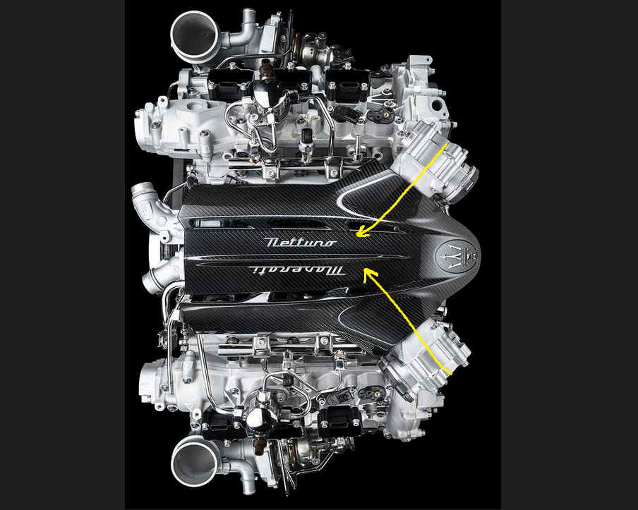Le V6 semble très compact, très bas et très avancé vers l’habitacle. Voici ci-dessous des images de ce moteur V6 ouvert à 90 degrés, les deux turbos sont sur les côtés, tout cela comme sur nos vieilles Biturbo chéries de l’autre millénaire qui étaient vraiment prémonitoires ! Mais le fameux Y de l’arrivée vers la chambre d’admission après les échangeurs se fait par l’arrière. Il est symbolisé ci-dessous en jaune :