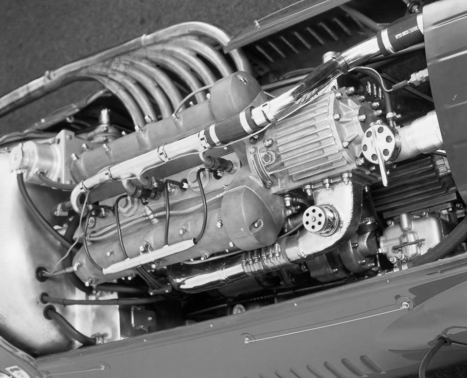 4 cylindres en ligne à refroidissement individuel, deux arbres à cames en tête, 4 soupapes par cylindre, 1.5 litres, deux compresseurs Roots superposés en avant, 1 tuyau d'échappement par soupape d'échappement soit 8 tuyaux, 270 cv avec 1.5 litres en 1947 !