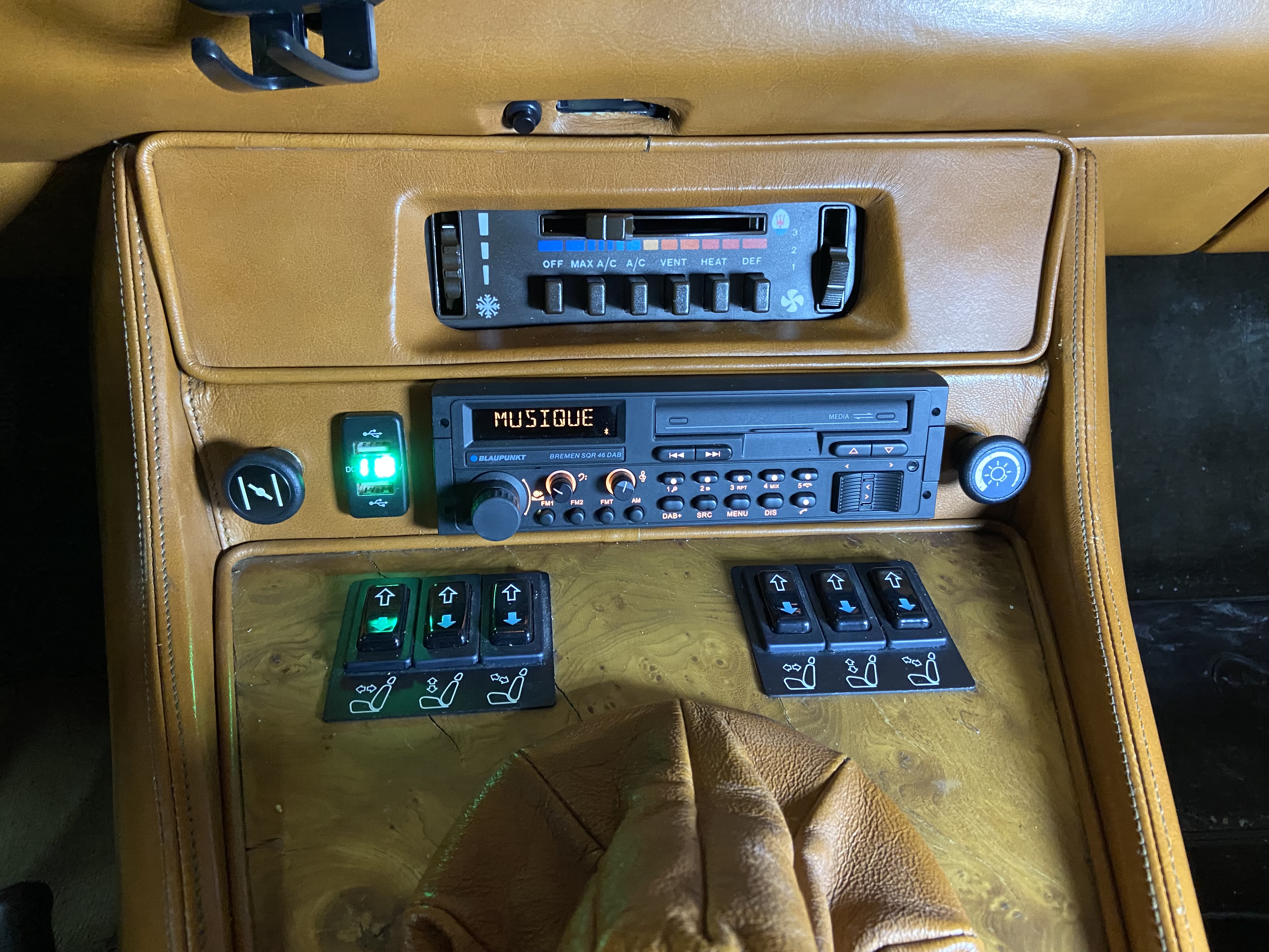 Enfin, l’antenne d’origine, cassée, est remplacée par une réplique Retrosound Mini Electric Automatic Antenna PA-03B (le challenge ici est que la trappe d’antenne ne permet pas l’installation d’un modèle standard, trop long), combinée à un amplificateur d’ondes pour le DAB.