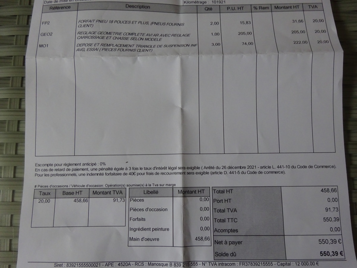 Voilà je viens de récupérer la miènne pour remplacement 2 pneus avant que j'ai fourni gros soucis d'usure géometrie à vau- l'eau et donc ils ont dû remplacés un bras inférieur avant G fourni aussi par mes soins