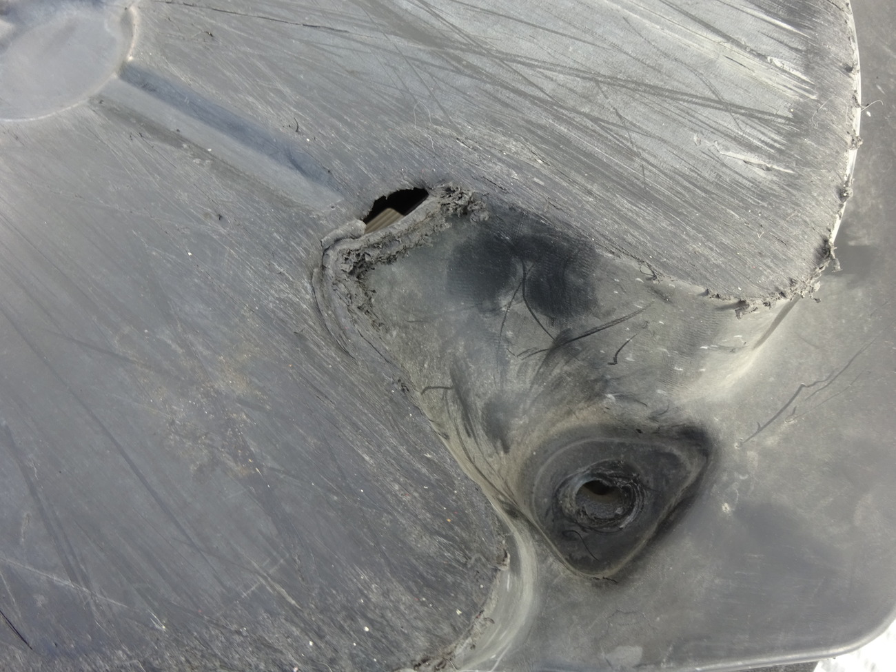 une patte de fixation au niveau de la boîte complètement tordue la voiture est défoncée dessous il y a même des trous en étoiles dans le cache les têtes de vis de berceau . Enfin voilà quelques agraffes avec l'agraffeuse thermique , rebouchage avec les moyens du bord bout de plastiques et fer à souder souflant c'est pas beau mais ça tient j'attends les aggraffes en U perdues pour remonter tout ça