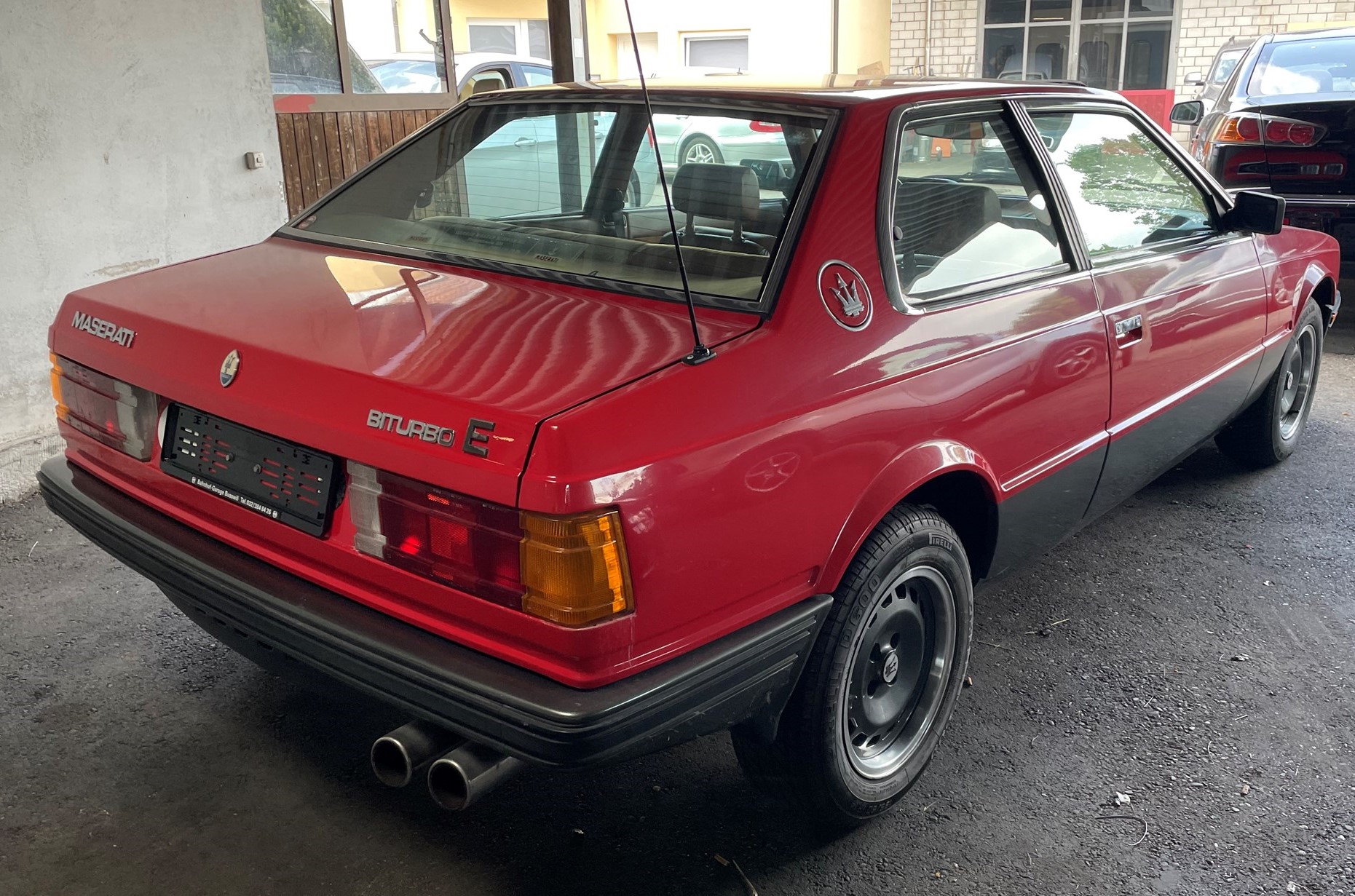 La Biturbo E, c'est autre chose, c'est très spécial. C'est parti d'une commande de Kjell Qvale, l’importateur Maserati aux USA pour la côte Ouest. Ce commercial avisé avait une clientèle californienne qui voulait une Biturbo plus sportive. Il s'entendit en 1985 avec l'usine Maserati pour la production de 500 exemplaires normes US, inchangés mécaniquement mais qui auraient l'aspect extérieur de la Biturbo S qui était sortie en Italie en 1983. On appela ces 500 exemplaires Biturbo E, pour Exportation car là il s'agissait cette fois-ci de les distinguer des Biturbo US "de base".