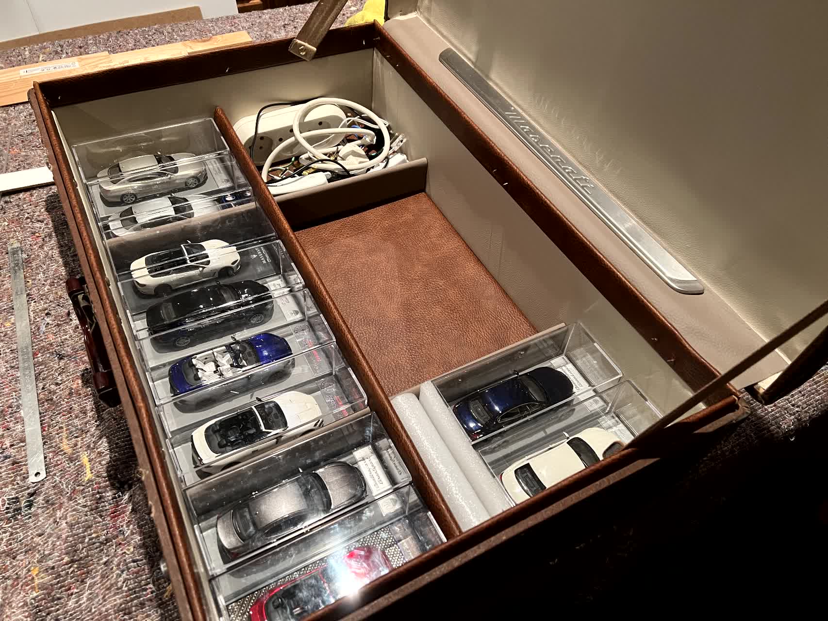 Je me suis livré à un petit calcul = une voiture miniature 1/43 dans sa boîte, c'est environ 730cm3, soit 0,73 litres. Pour loger les plus de 380 Maserati du musée, à supposer que les dimensions des valises tombent juste sans perte de place, il faudra donc de l'ordre de 9 valises taille "cabine" de 31 litres :mrgreen: