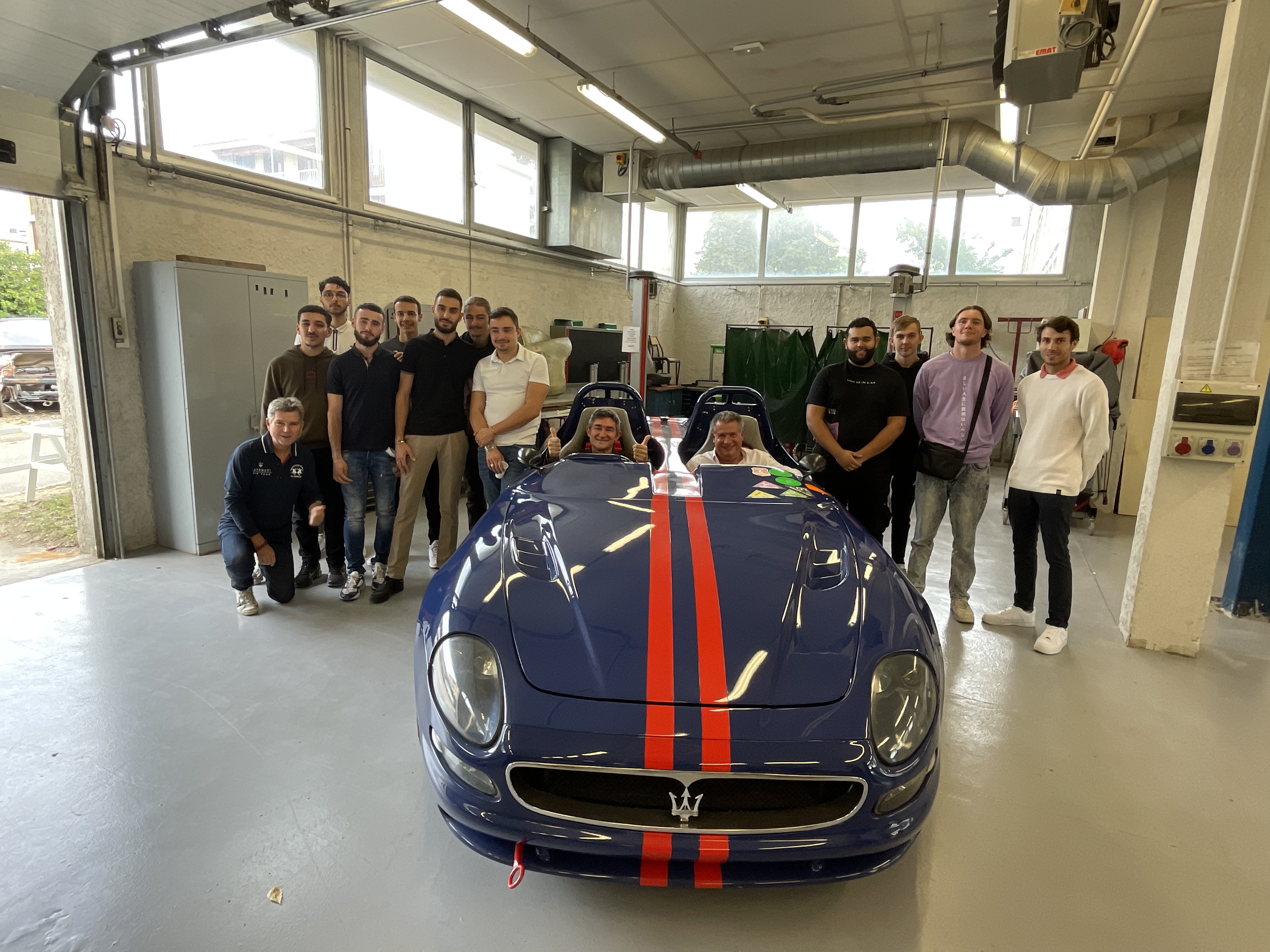 Ci dessus avec les élèves du lycée Mistral, Domi 13 accroupi à gauche, votre serviteur au volant (right hand drive comme les barquettes S auxquelles la 320S Vittoria rend hommage) et le professeur de carrosserie Yann Perret en passager.