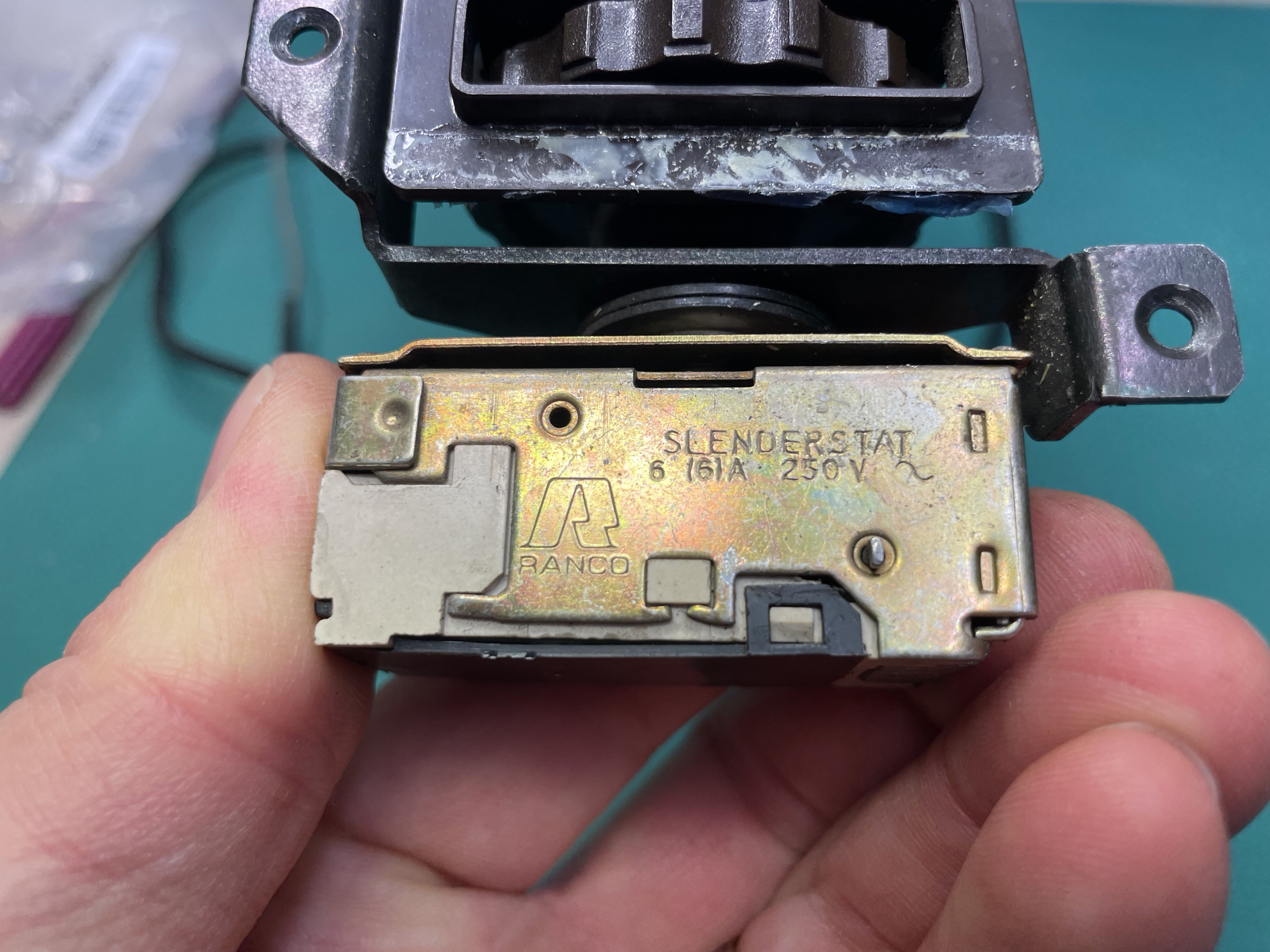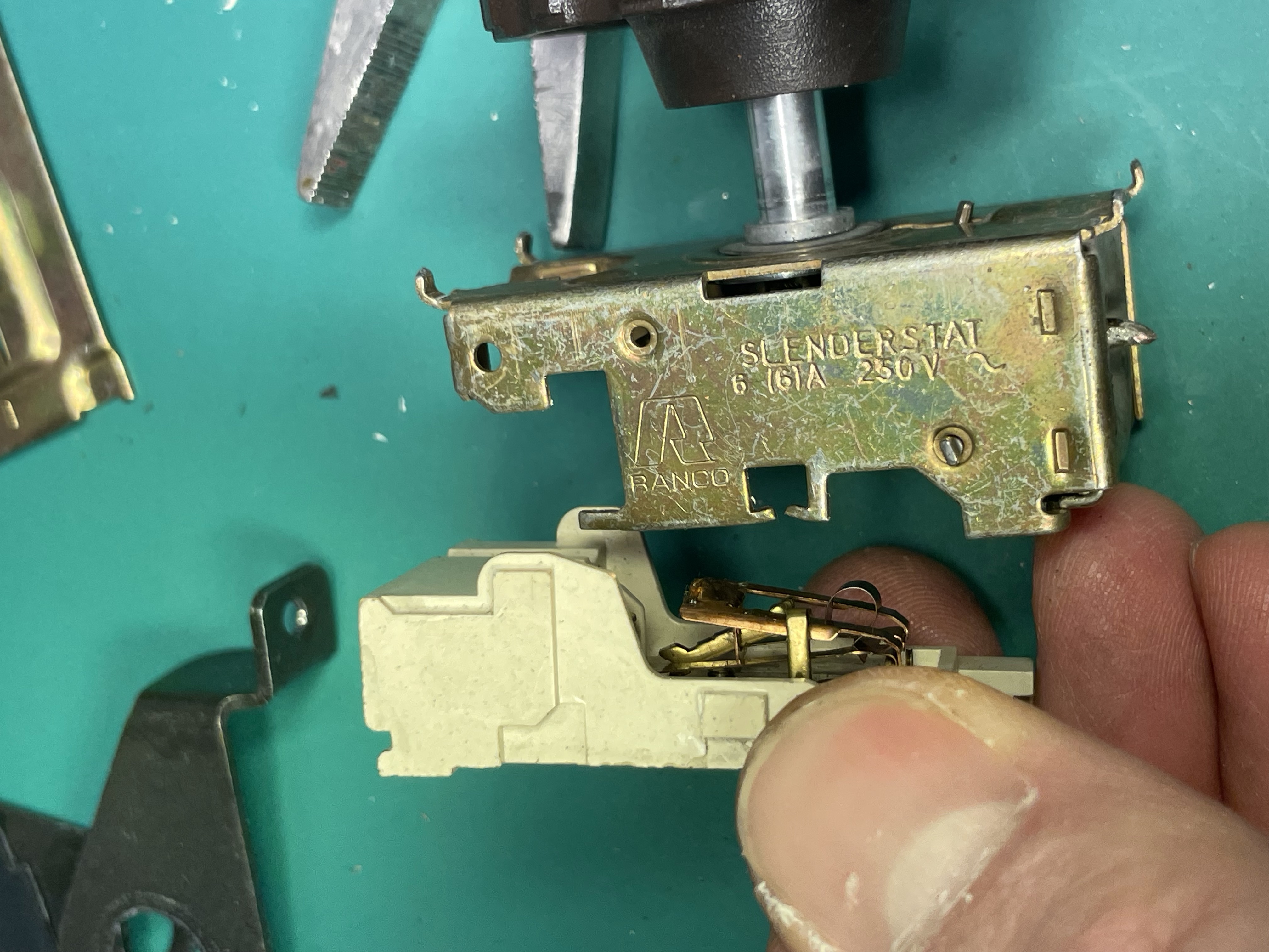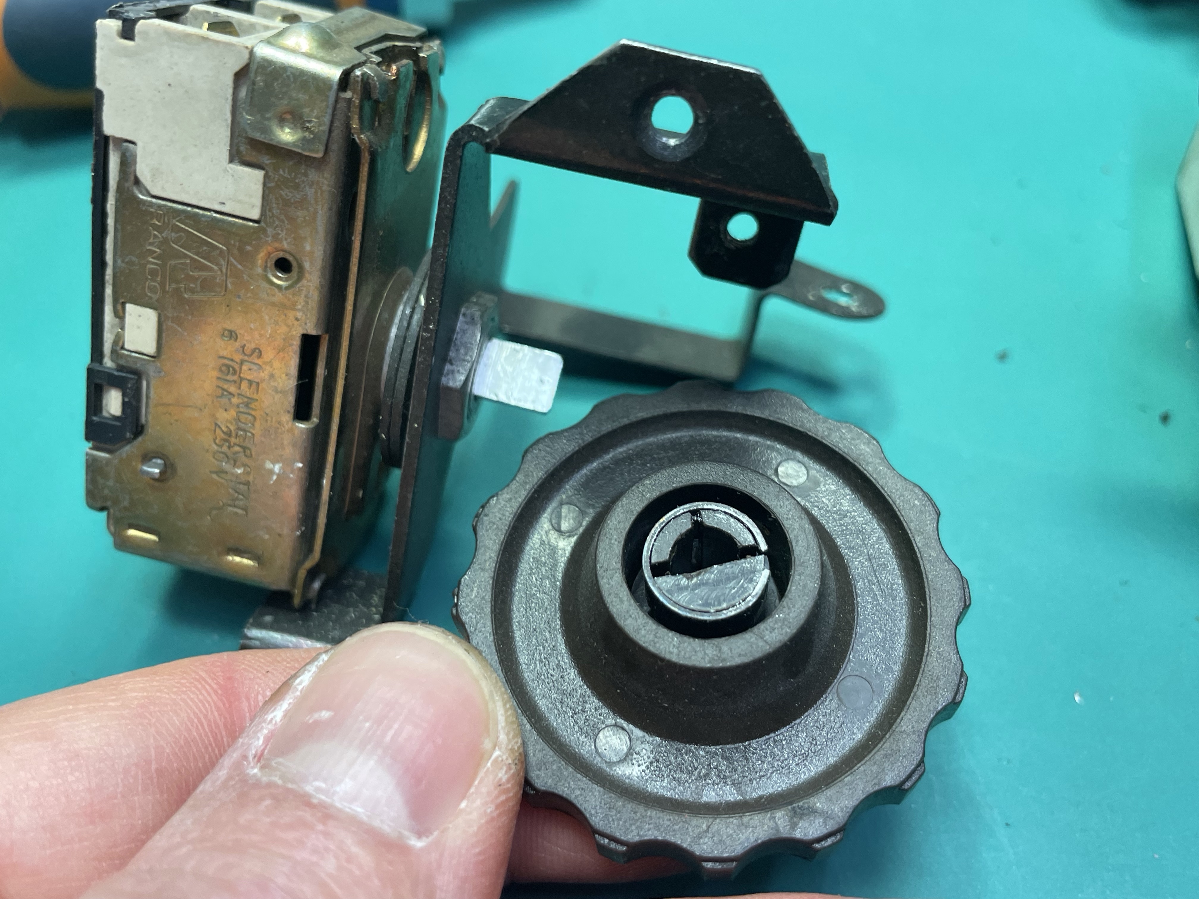 Pour faire simple, à l’intérieur il y a une petite soupape avec une course très courte d’environ 1mm qui pousse un levier réglable avec un ressort de rappel et dont la course varie avec le réglage de la température. Ensuite ce levier vient pousser un interrupteur dont la course peut être aussi réglée, cela permet d’avoir plus ou moins de jeu sur la rotation de la commande… mais en réel la moitié de la course ne sert à rien mécaniquement…