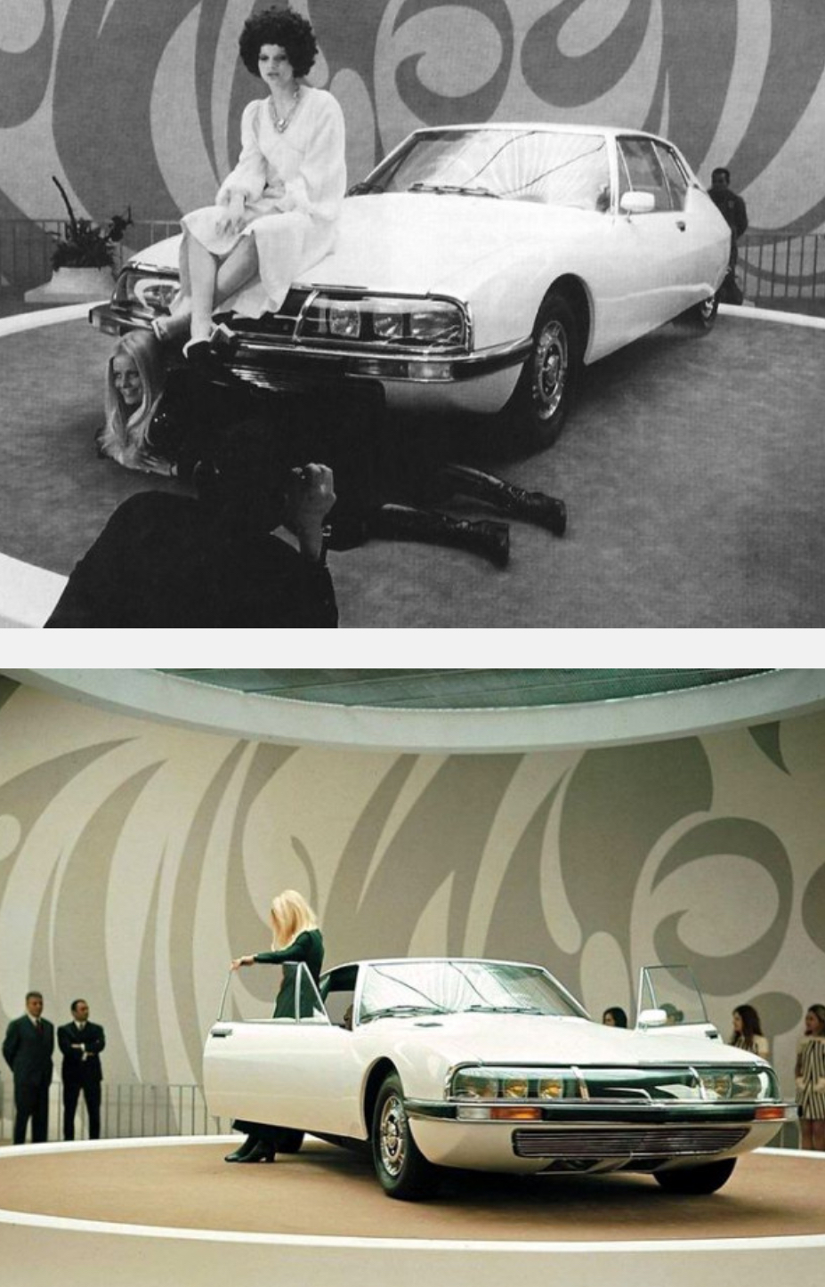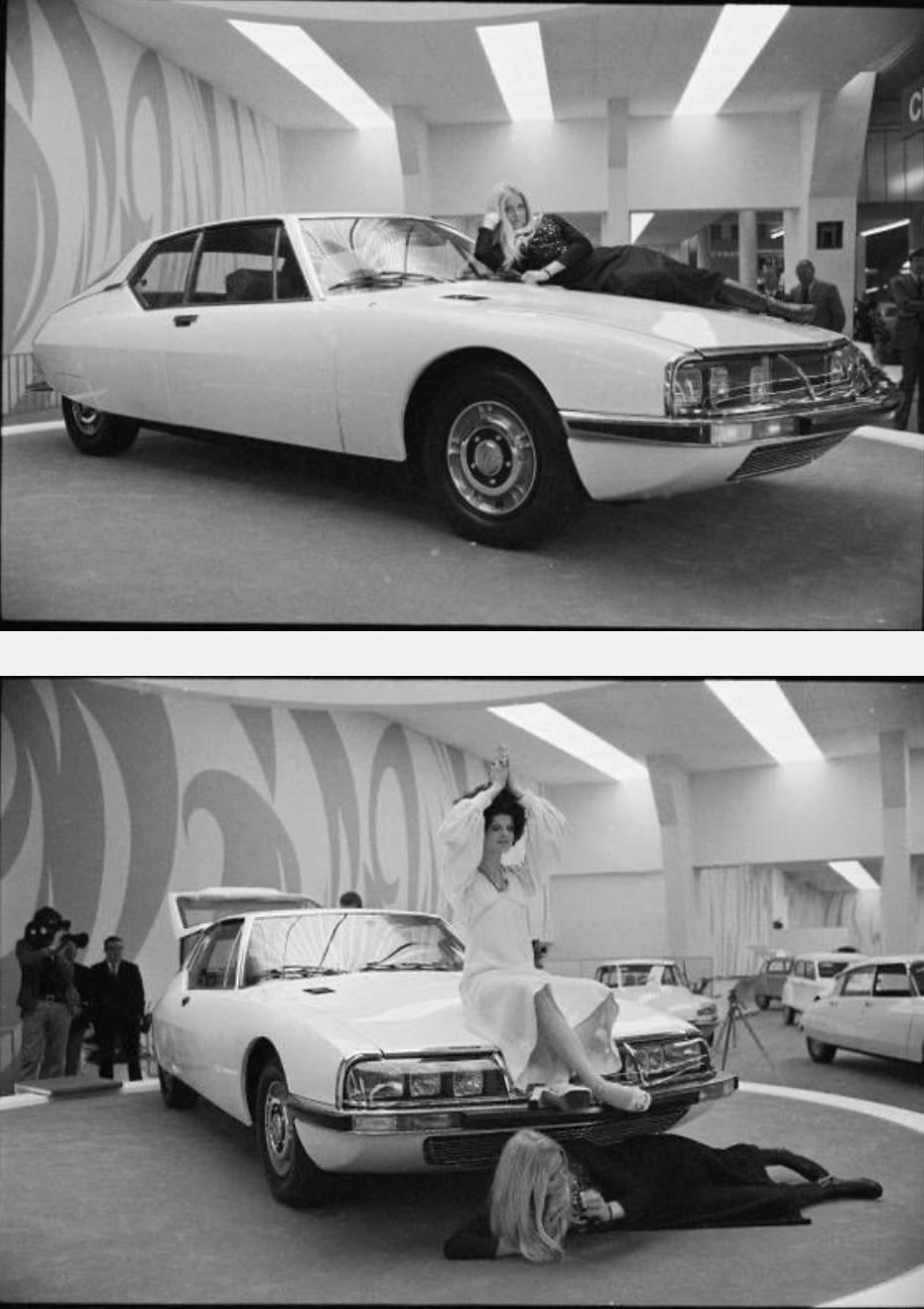 Il y a 55 ans jour pour jour, le 12 mars 1970, était présentée la SM au salon de Genève, dans une ambiance un peu psychédélique avec une blonde en noir et une brune en blanc ! 😀