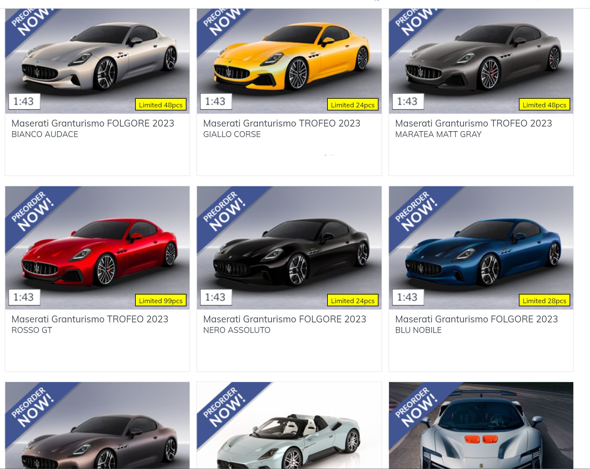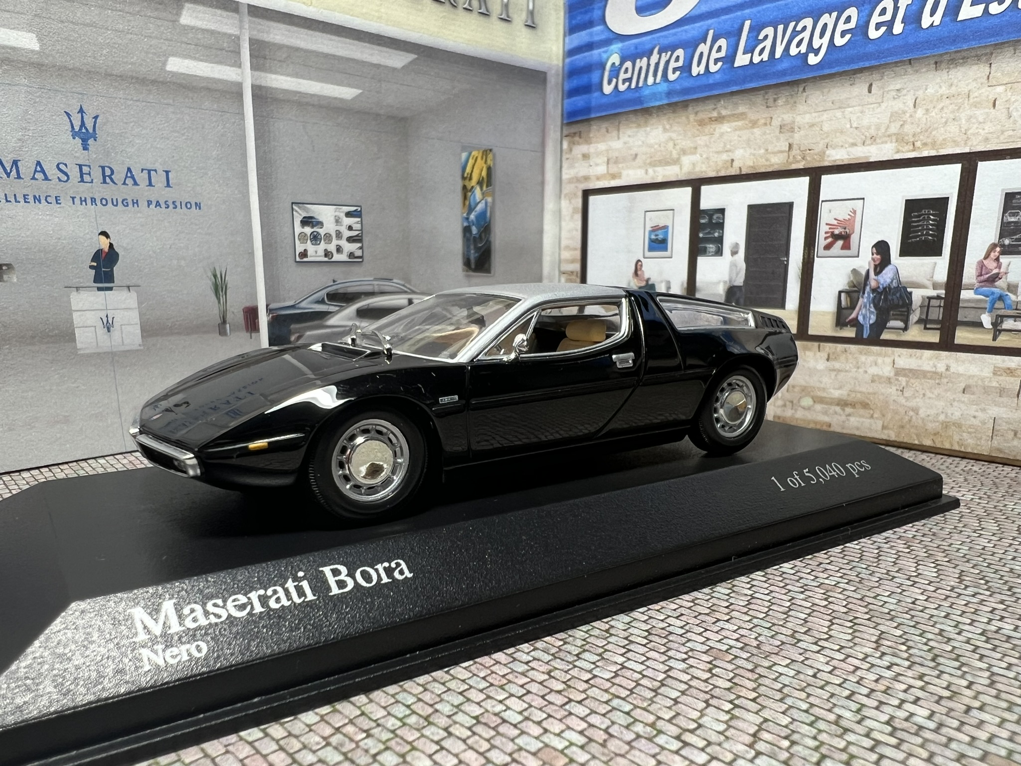 Bora- Minichamps : Ghibli Spider- Minichamps : Gransport Trofeo- IXO : Les voitures sont neuves, sous vitrines et surboites en carton. Produits officiels Maserati.