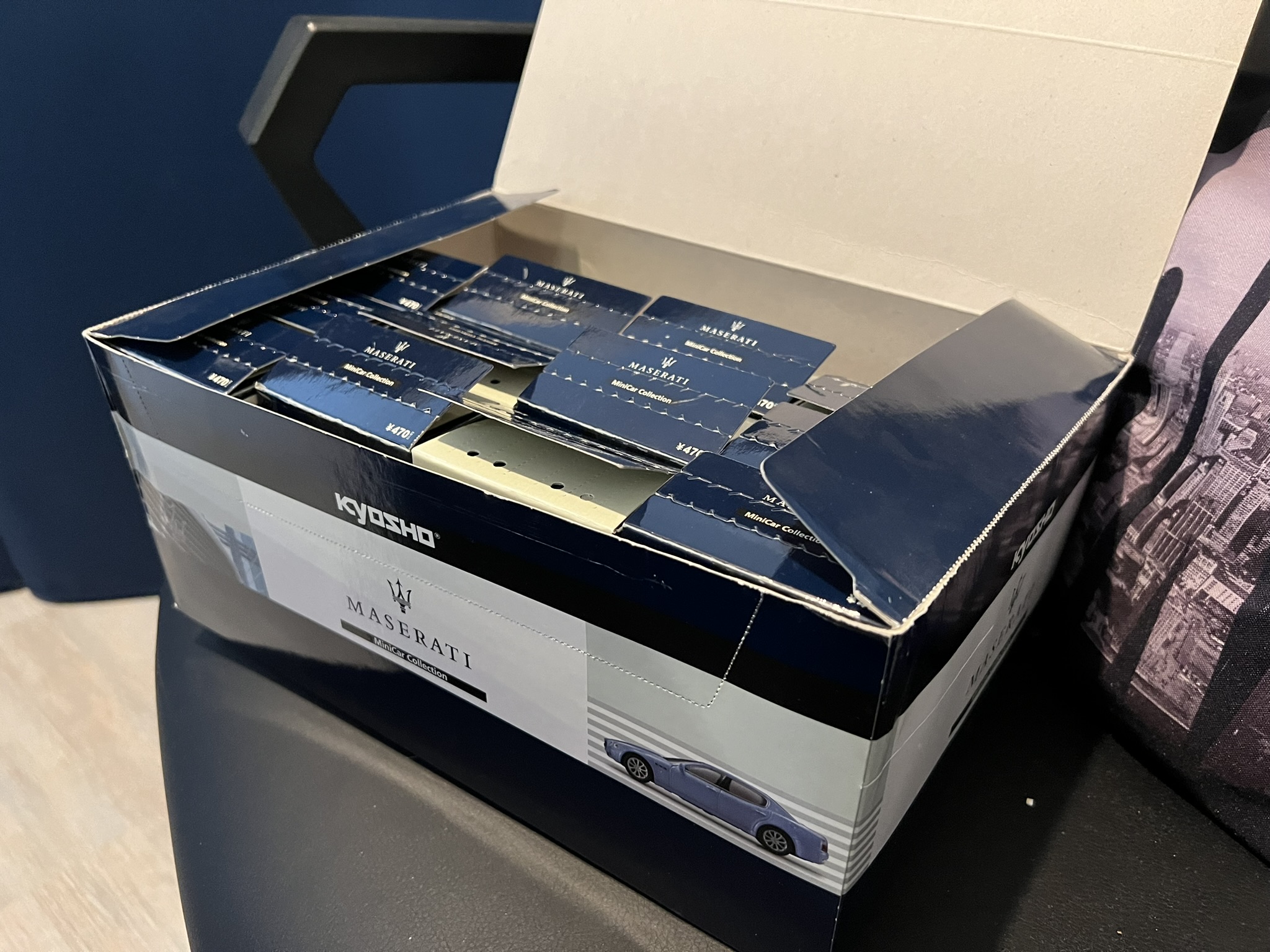 J'ai donc pu acquérir un lot de 12 aux enchères pour moins de 8€ par voiture. Plutôt un bon prix si j'en juge par les modèles vendus à l'unité. Là , il y a tout : boite, surboite, cartes de présentation. Voilà ce que ça donne :